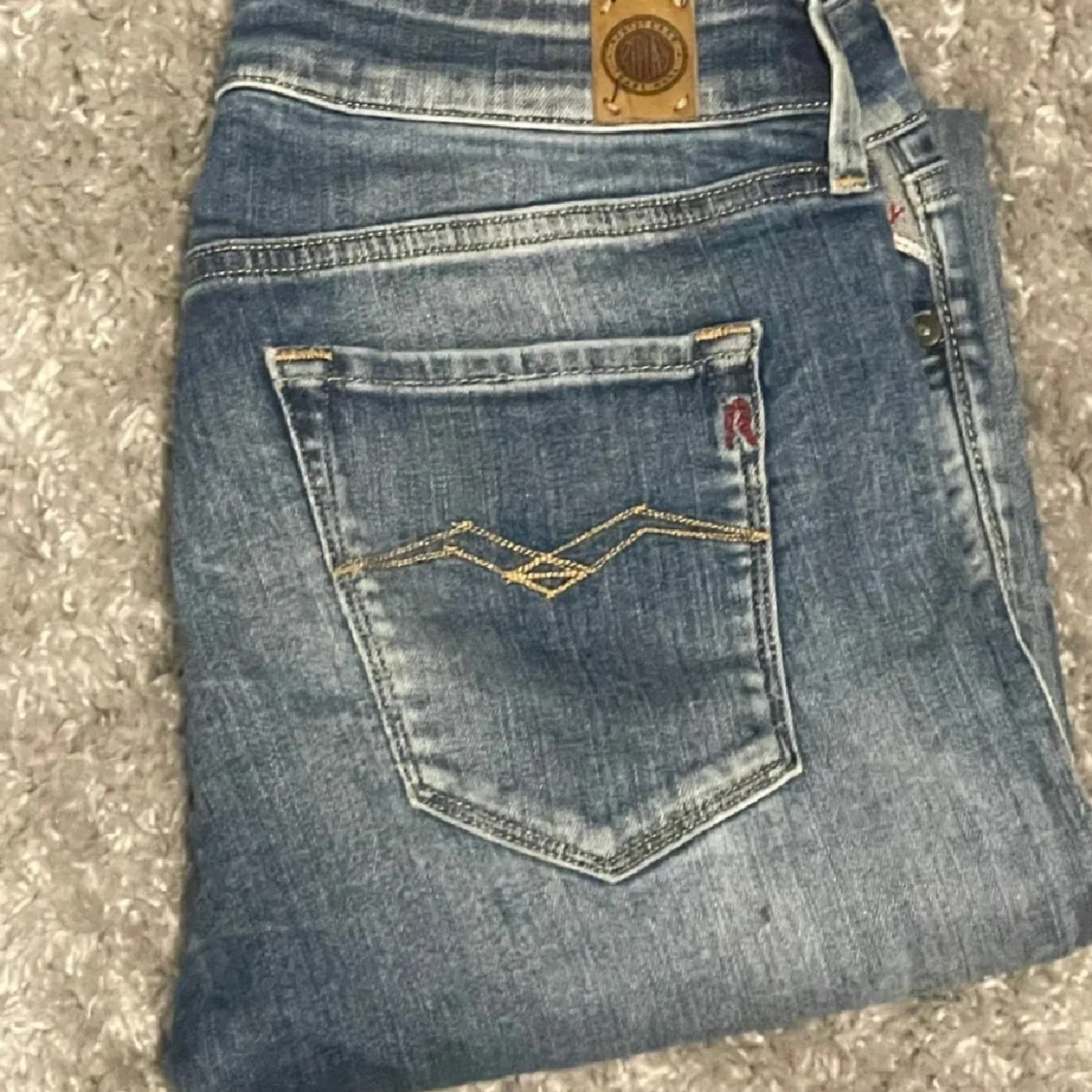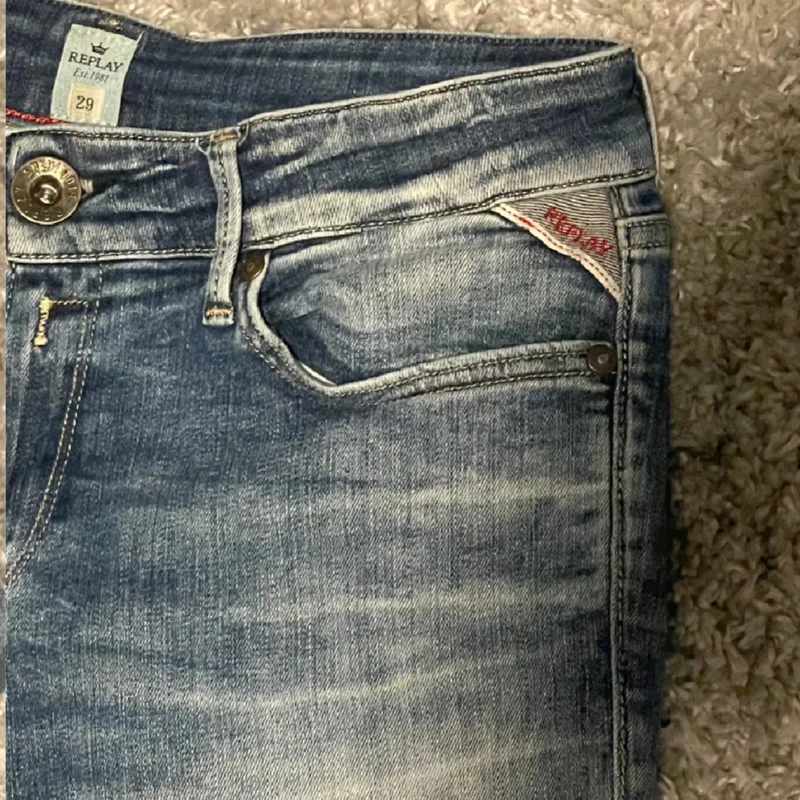 Snygga blå jeans från Replay med raka ben och klassisk femficksdesign. Jeansen har slitningar och ljusare partier för en cool, använd look. Gula kontrastsömmar på bakfickan och Replay-logga vid fickan fram. Perfekta för dig som gillar en avslappnad stil.