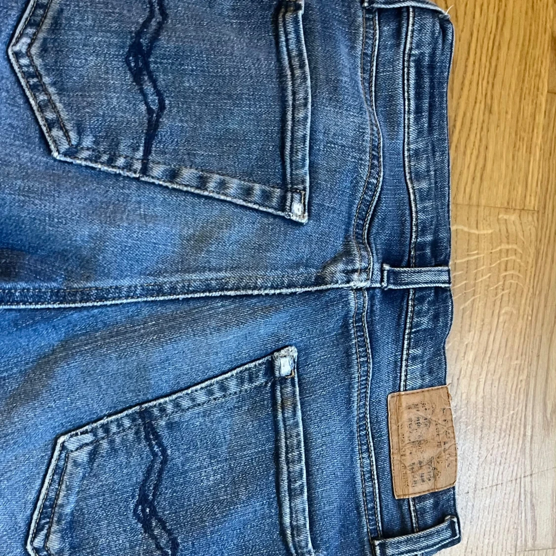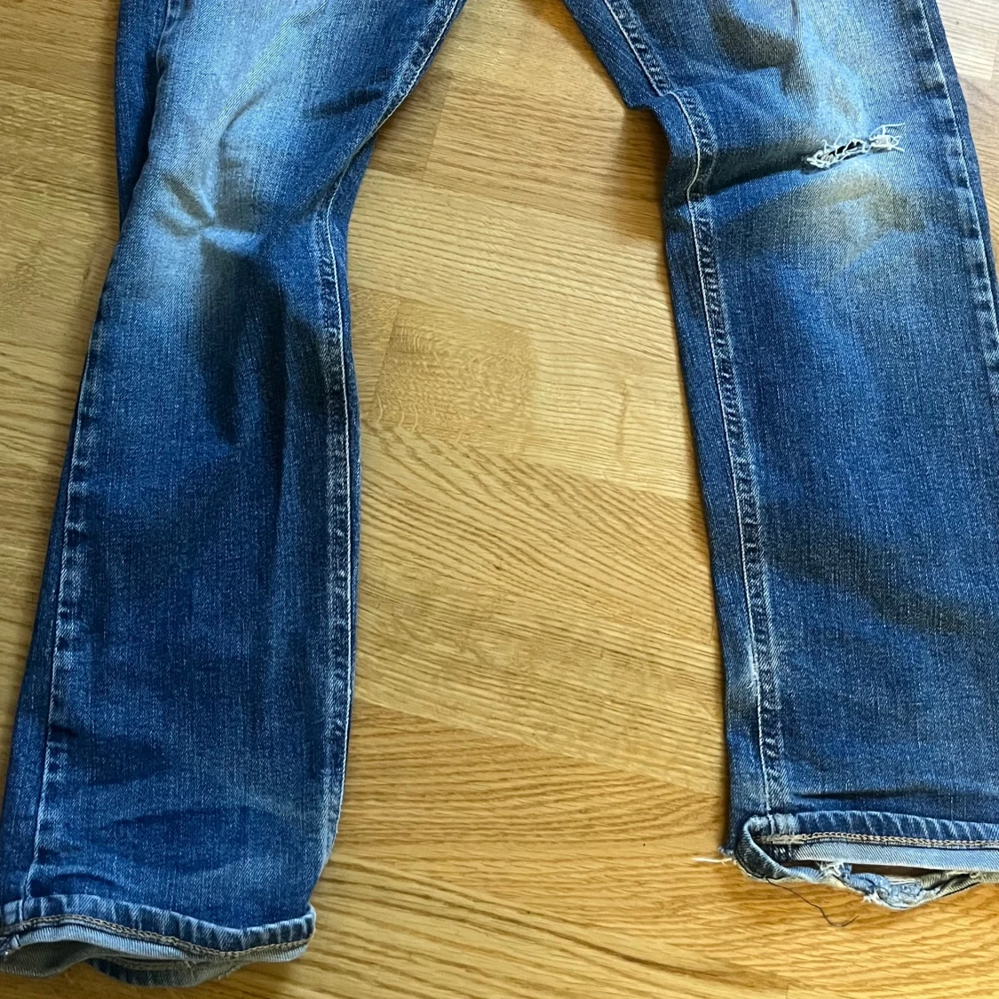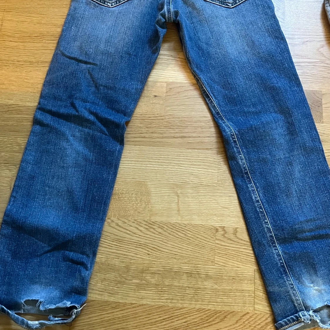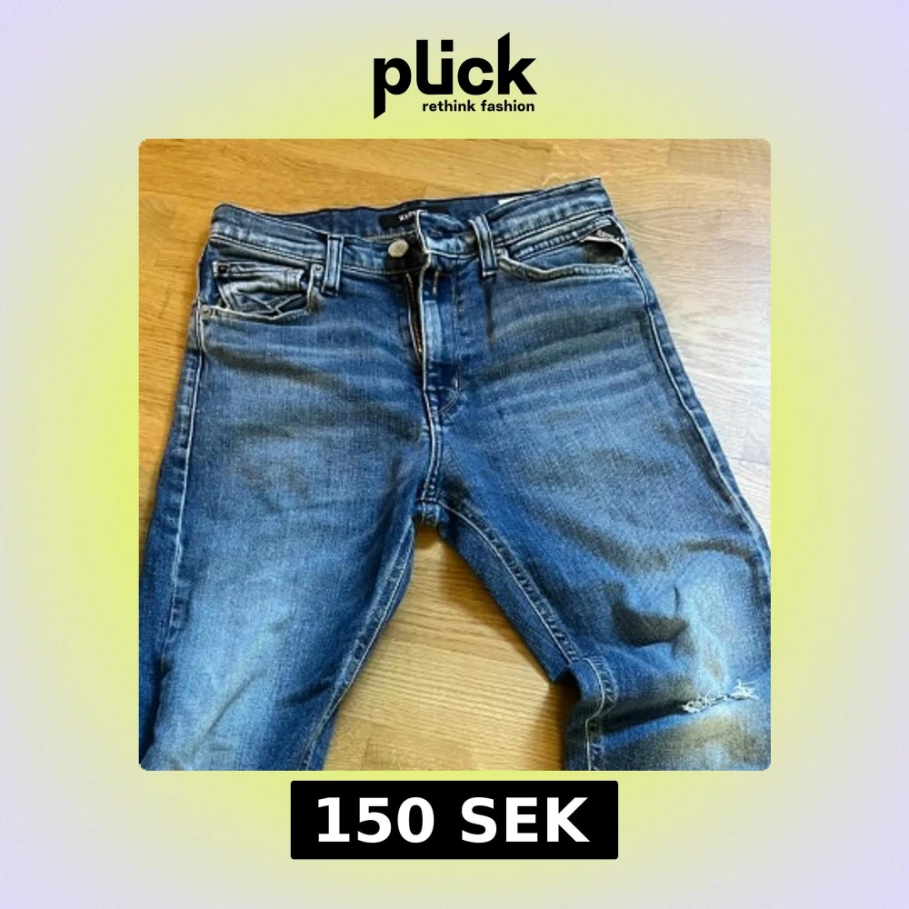 Säljer ett par snygga blå jeans från Replay med klassisk femficksdesign och slitna detaljer vid knä och benslut. Jeansen har rak passform och normal midja, med coola tvättade effekter och logopatch bak. Perfekt för dig som gillar en avslappnad streetstil.