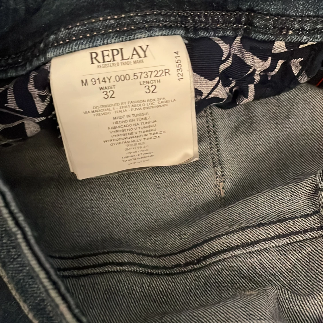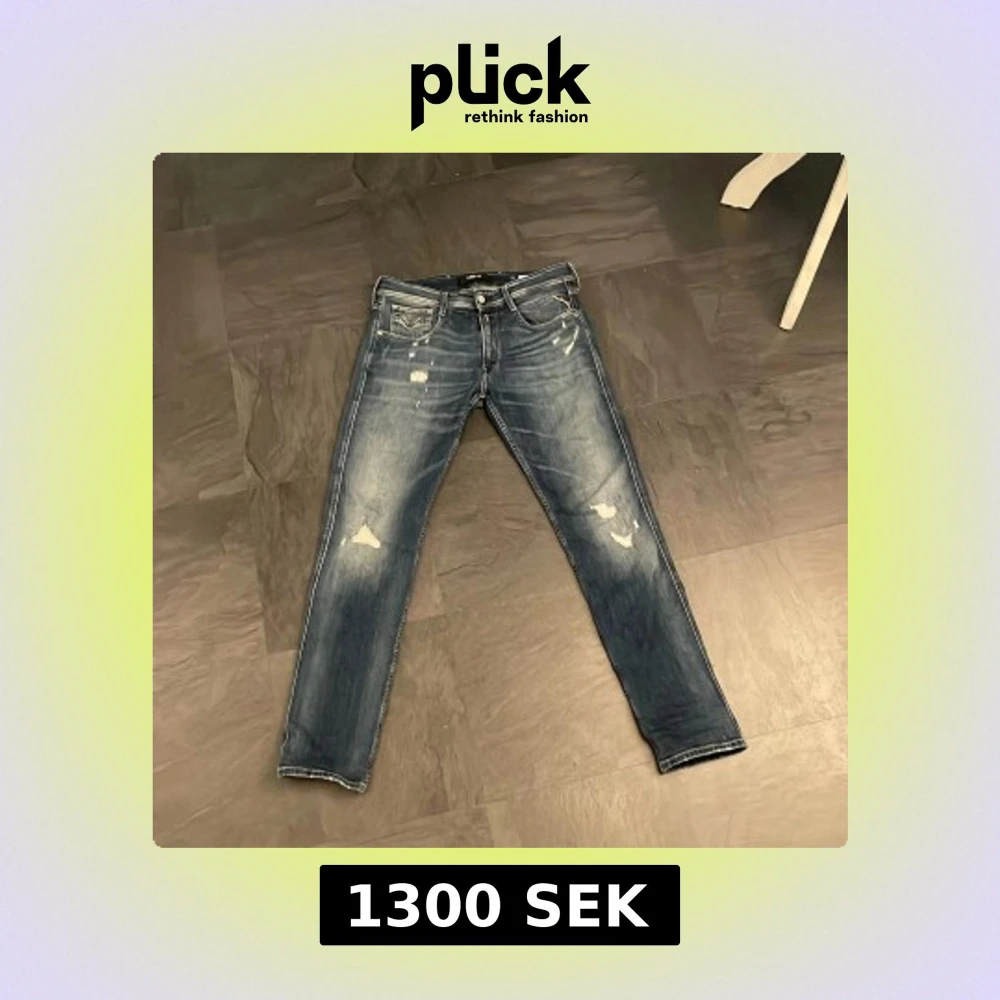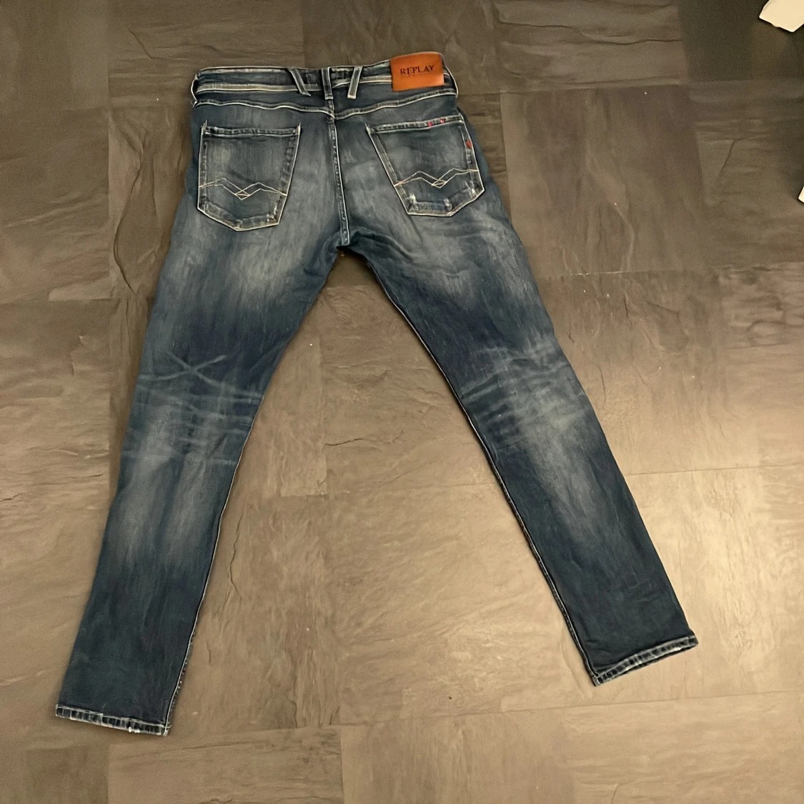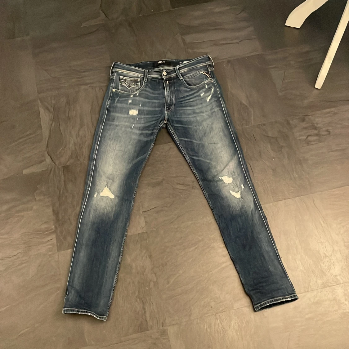 Säljer ett helt oanvända snygga Replay jeans i flashig blå färg med slitningar. Passform är slimfit, med storlek W32 L32. Ny pris 2000kr