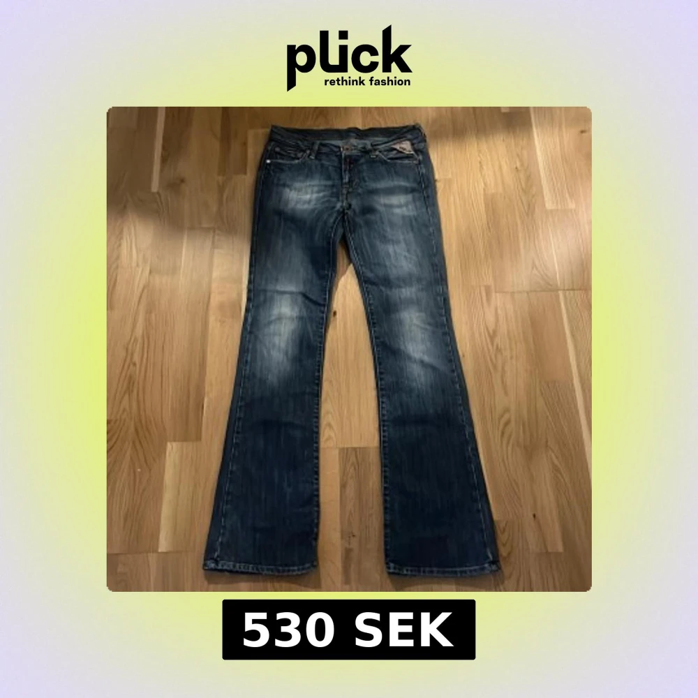 Snygga bootcut jeans från Replay i mörkblå tvättad denim med slitningar och broderad logga baktill. Klassisk femficksmodell med dragkedja och knapp. Perfekta för dig som gillar en retro vibe och vill ha ett par jeans med lite extra attityd. De är lite slitna längre ner på byxan, även lite på bakfickorna men knappt använda!!