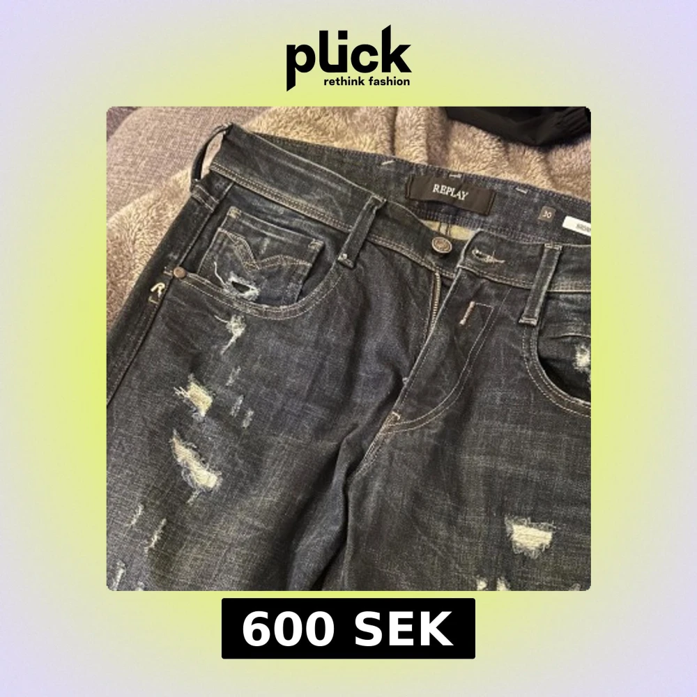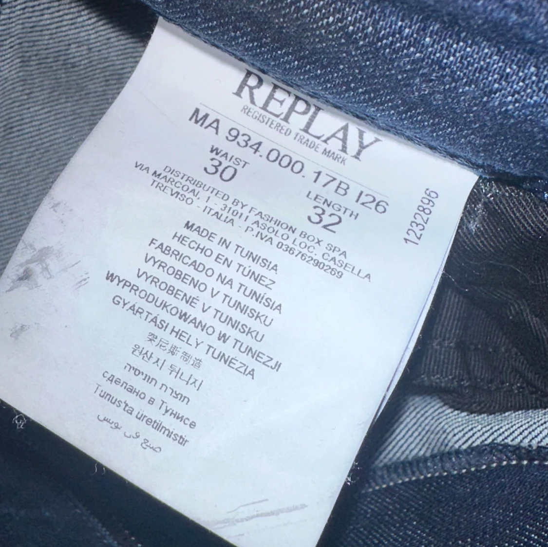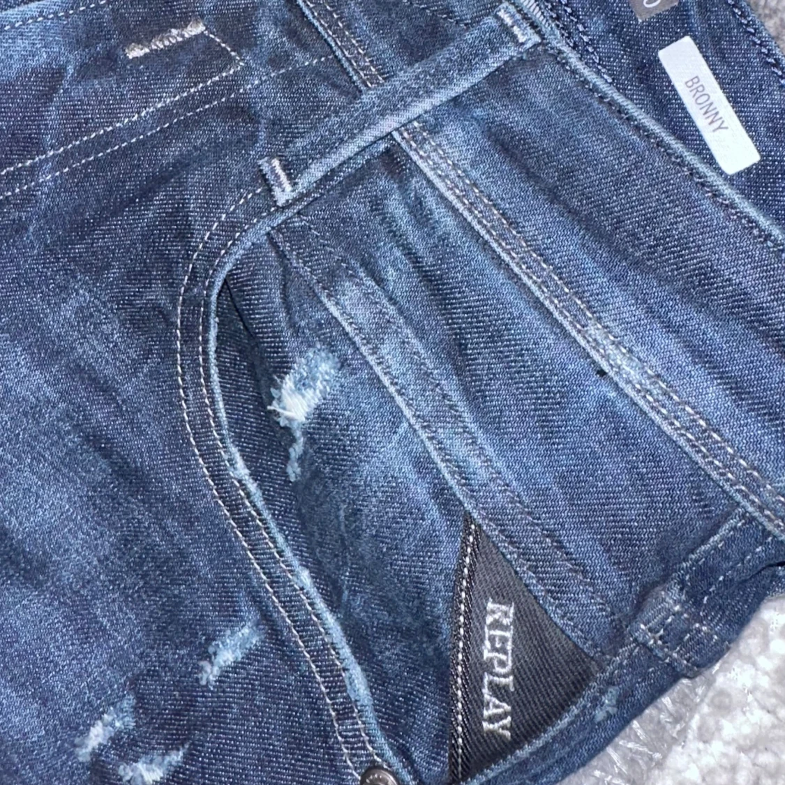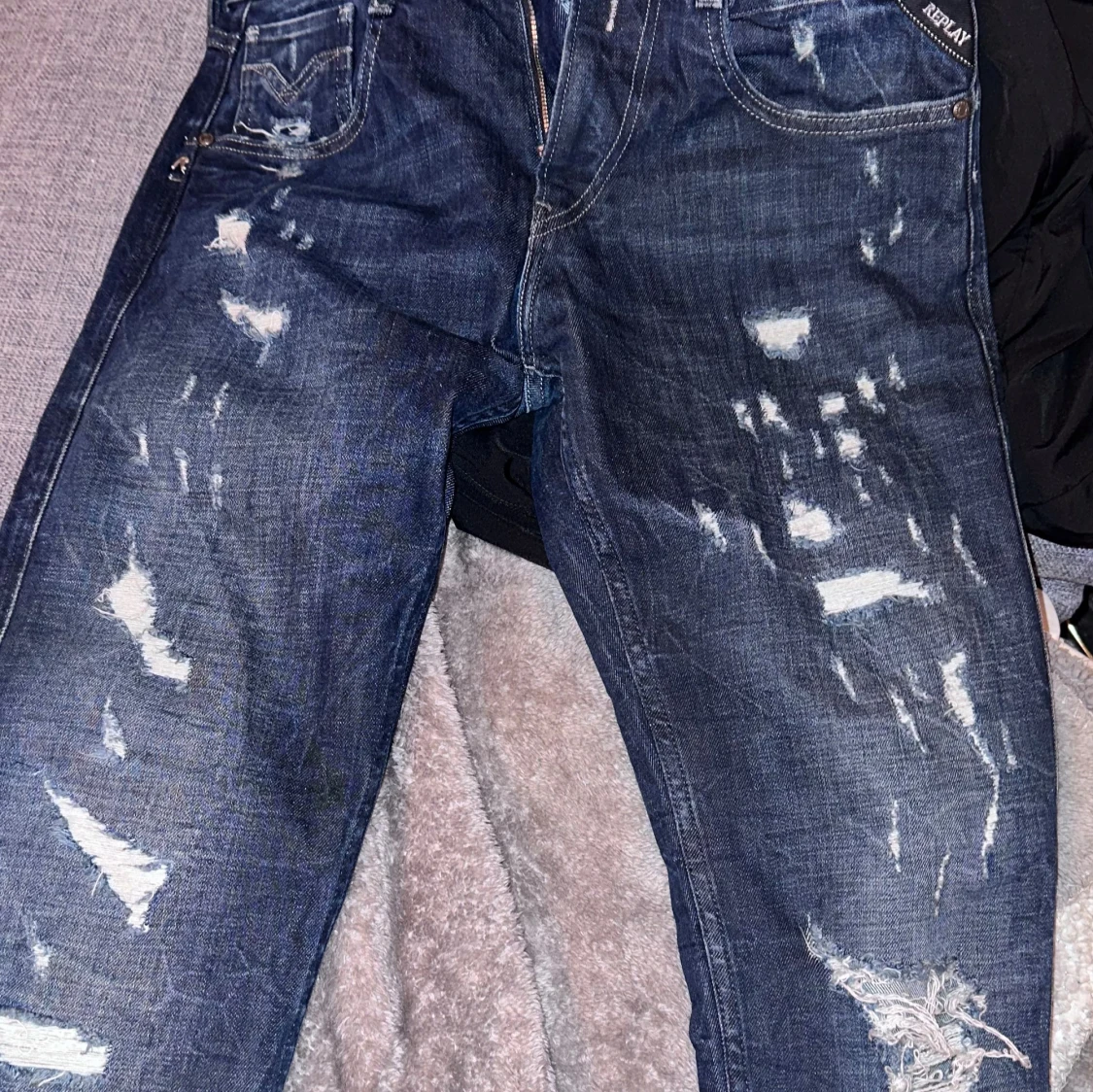 Säljer ett par Replay Bronny jeans i mörkblått med slitningar anledning passar ej