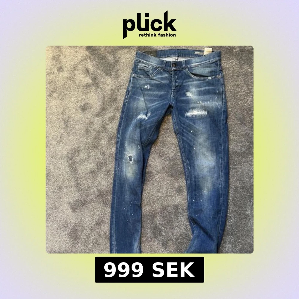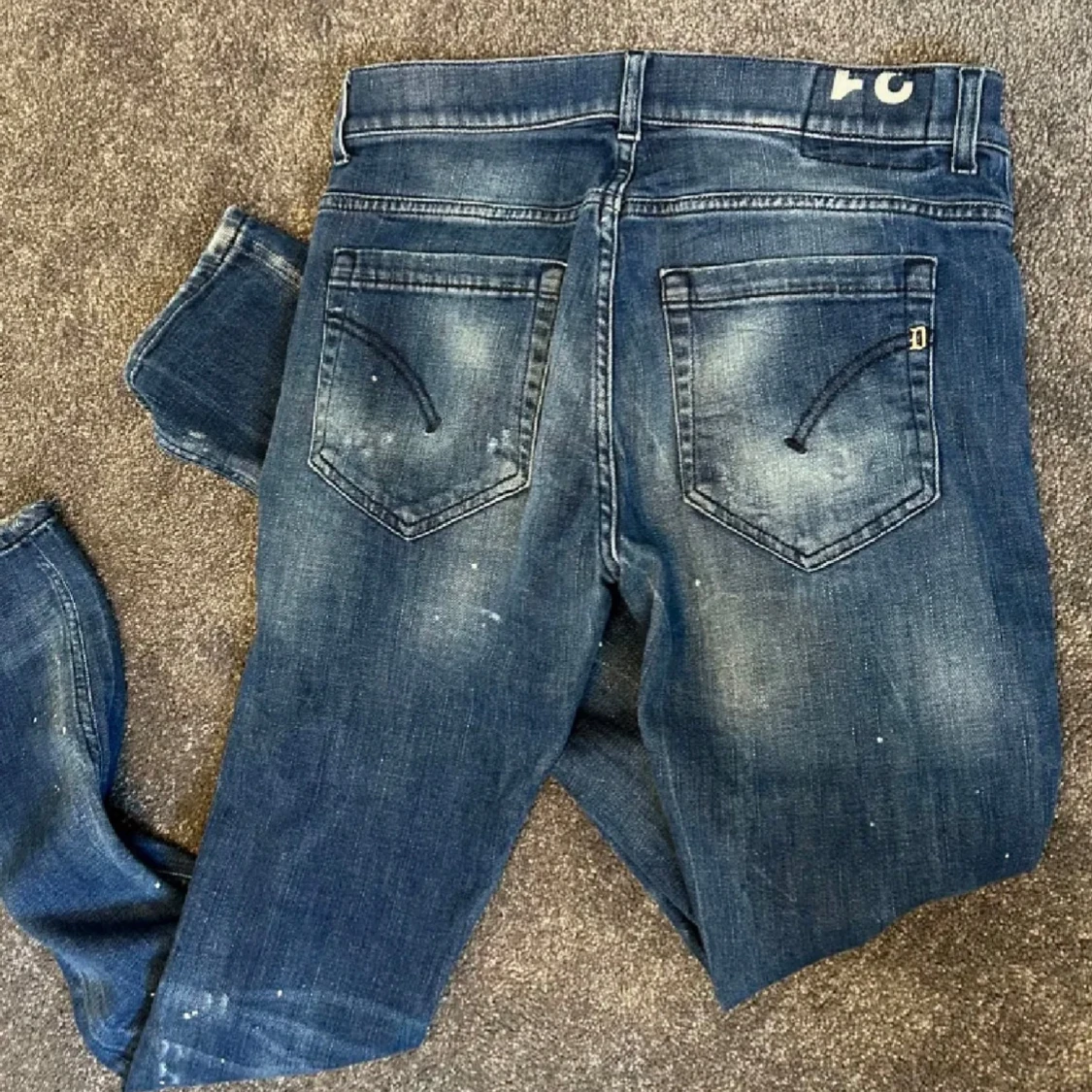 Säljer ett par blå jeans från dondup med coola slitningar och färgstänk för en trendig look. Byxorna har klassisk femficksdesign, normal passform och knappgylf. Perfekta för dig som gillar en avslappnad och modern stil.