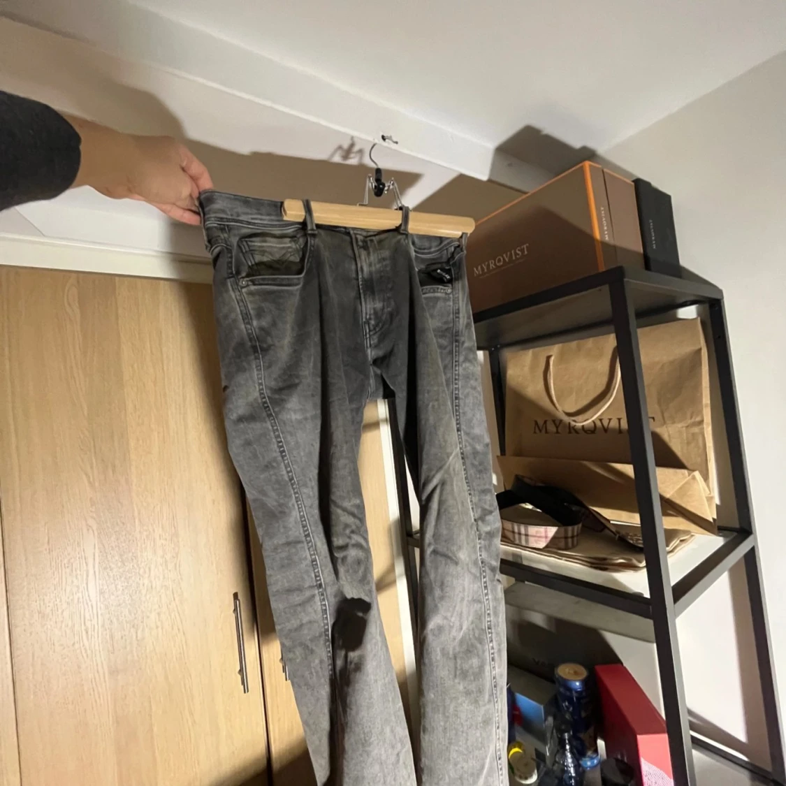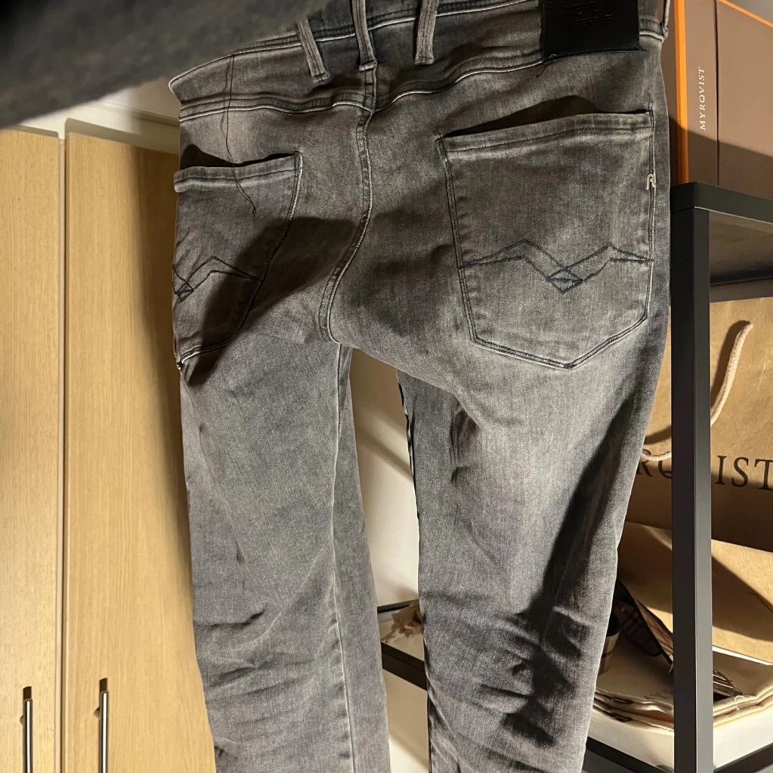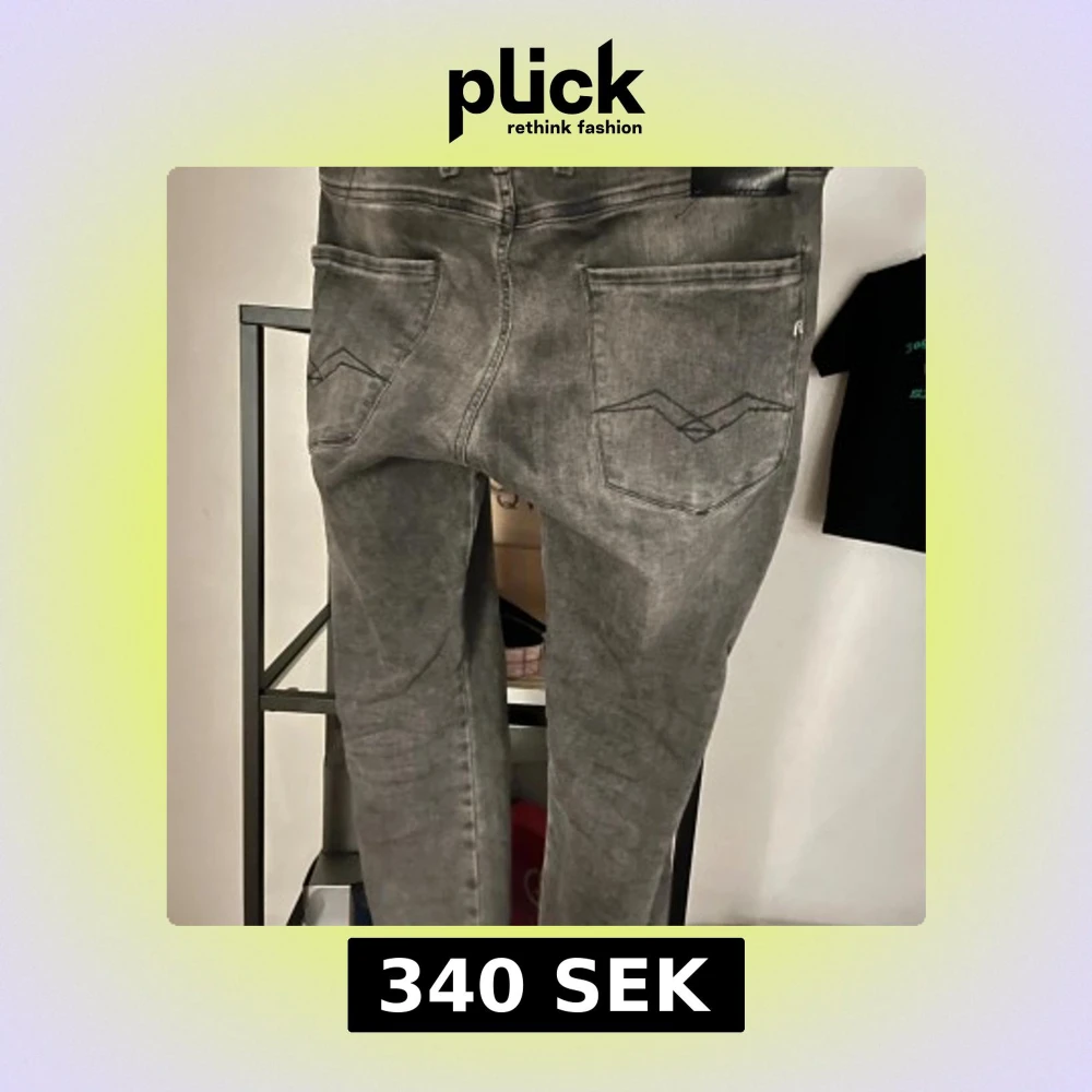 Säljer ett par grå jeans från Replay med klassisk femficksdesign och raka ben. Jeansen har diskreta sömmar på bakfickorna och en snygg tvättad look. Perfekta för dig som gillar en stilren och avslappnad vibe 😎