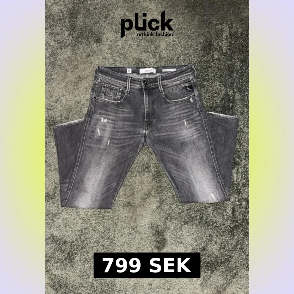 Snygga grå jeans från Replay med tidlösa slitningar och tvättad look. Klassisk femficksmodell och tydliga kontrastsömmar. Jeansen har en slim fit passform och är tillverkade i mjukt denimtyg för en bekväm känsla.