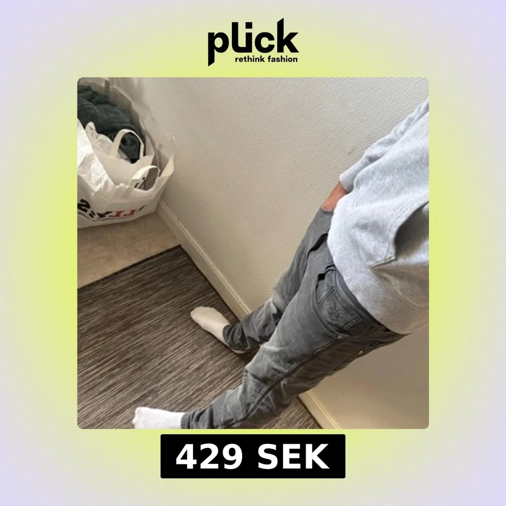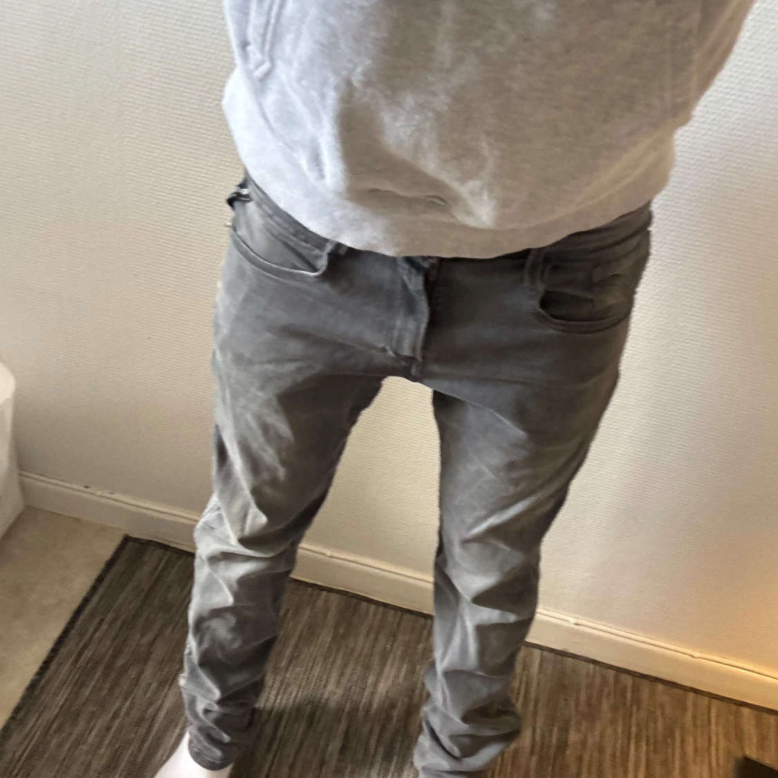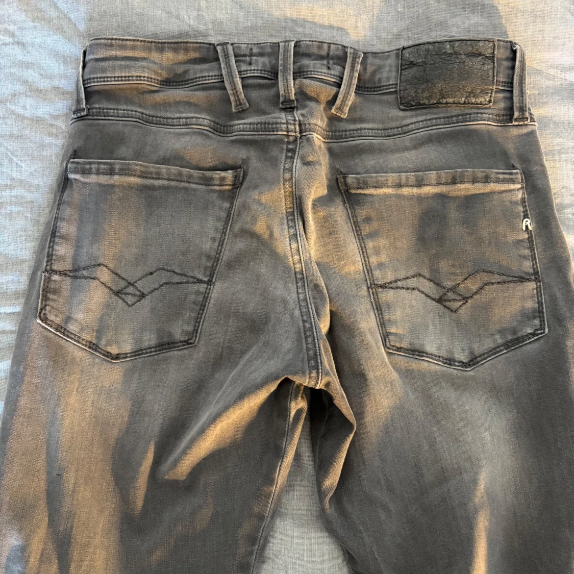 Säljer ett par grå jeans från Replay med snyggt tvättad look och klassiska fem fickor. Jeansen har smal passform, normal midja och diskreta detaljer på bakfickorna. Perfekta för dig som gillar stilrena och bekväma jeans med lite edge.