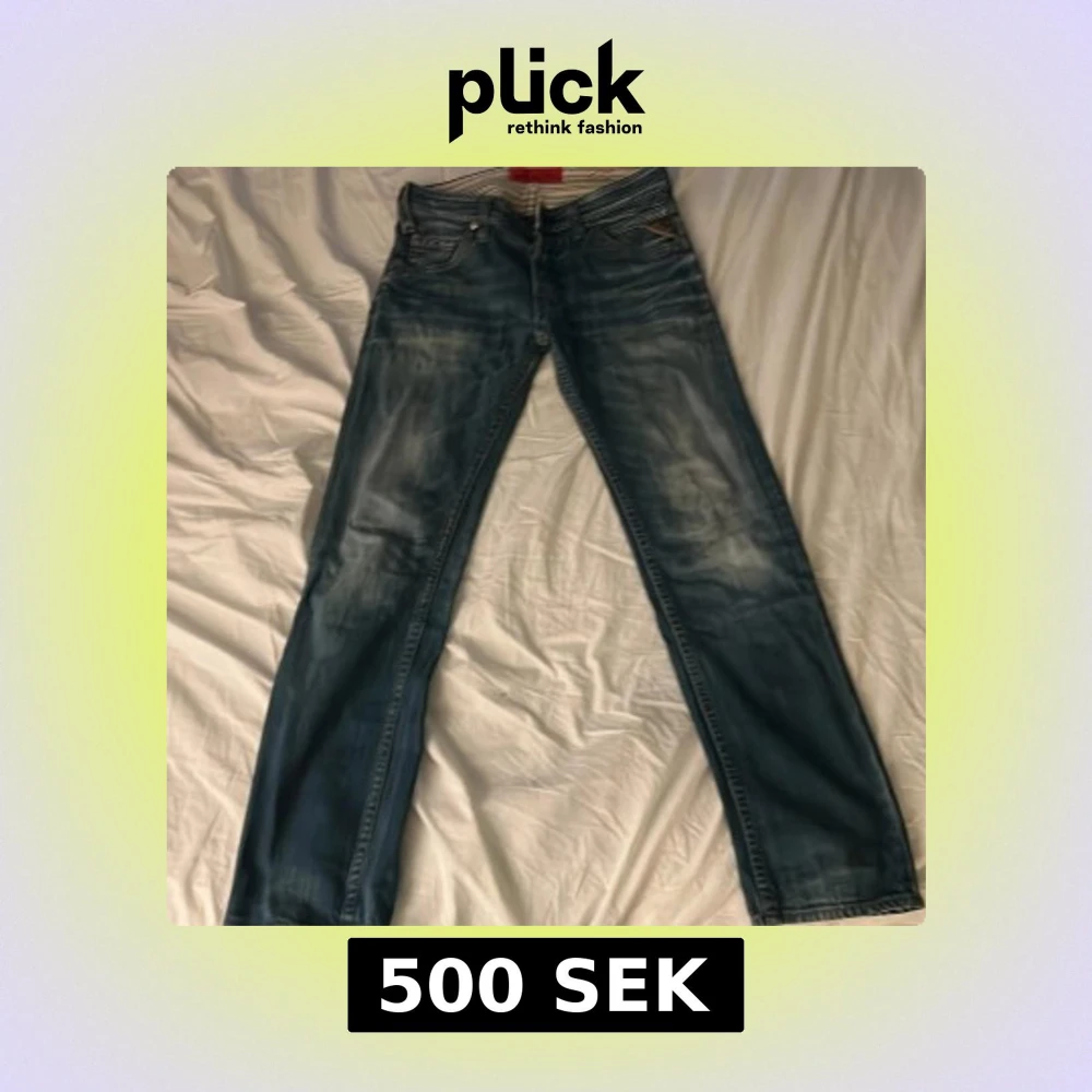 Snygga Replay Grover jeans i blå tvätt med slitningar och klassiska fem fickor. Jeansen är små med en waist på 28 men fortfarande snygga, de är väldigt fina och inte använt mycket. Det är bara att höra av sig vid fler frågor👏