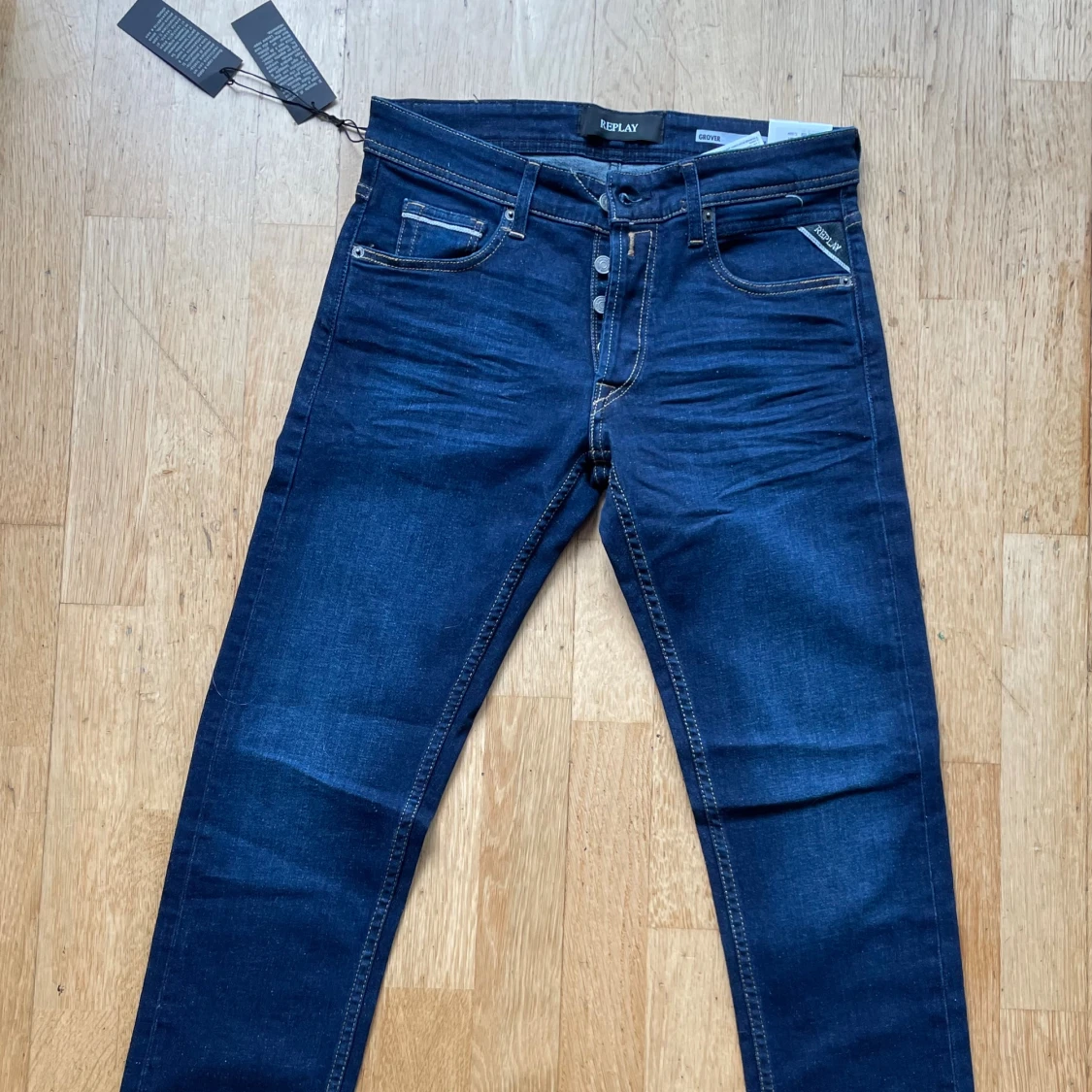 Mörkblå Replay Grover jeans med straight fit och klassisk femficksdesign. Snygga kontrastsömmar och detaljerad bakficka med broderad vit linje. Jeansen har knappgylf och läderpatch bak i midjan. Perfekt för dig som gillar stilrena och tidlösa jeans. Nypris 1300‼️ tveka inte att höra av er vid frågor eller förslag‼️🙌 w29 l32