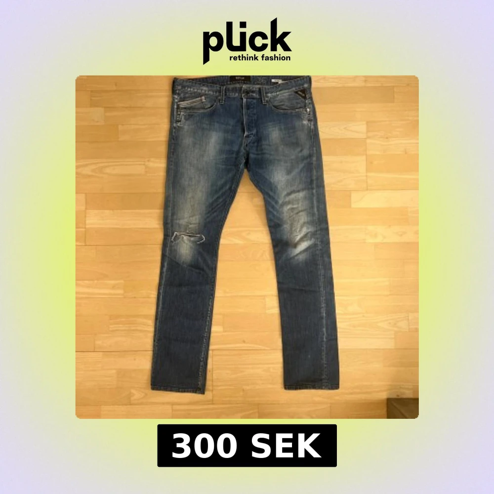 Säljer ett par klassiska blå Replay jeans med raka ben och snygga slitningar. Byxorna har fem fickor, dragkedja och knapp i midjan samt Replay-logga på bakfickan. Perfekta för en avslappnad stil.