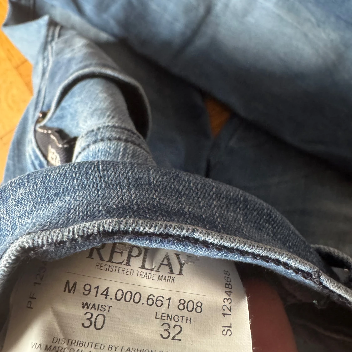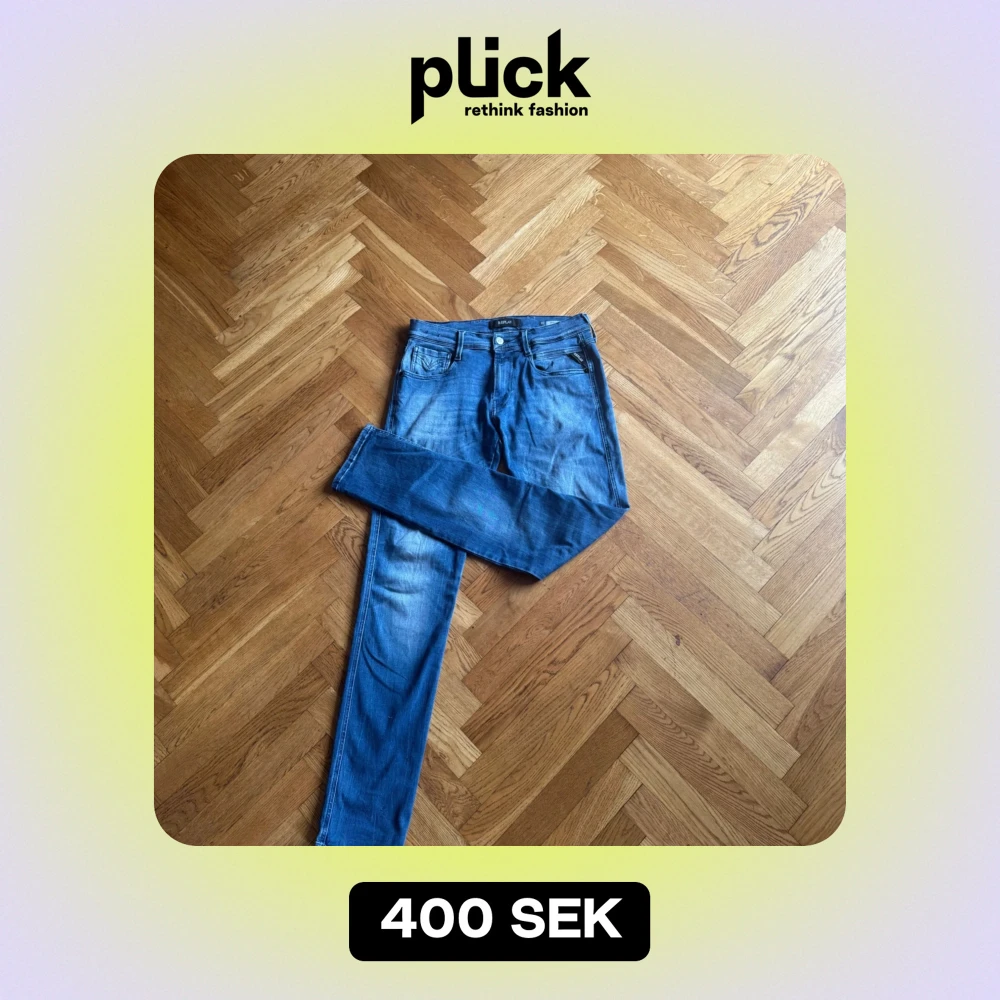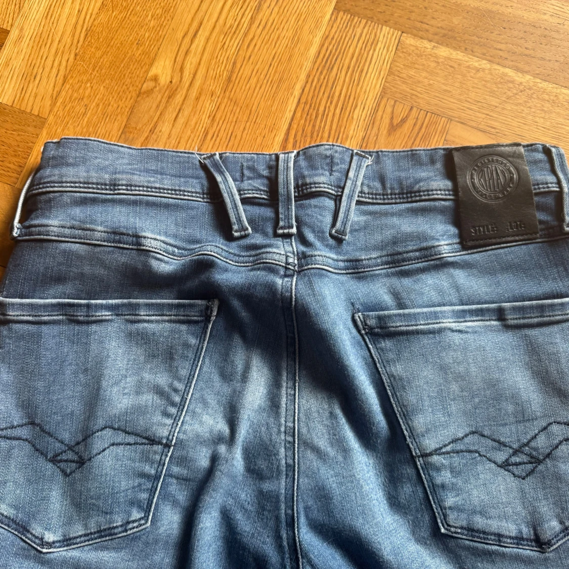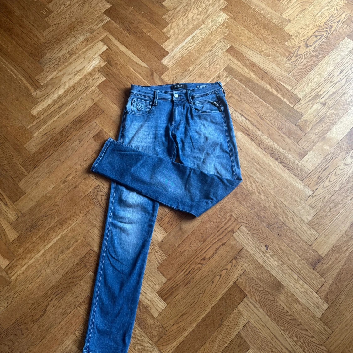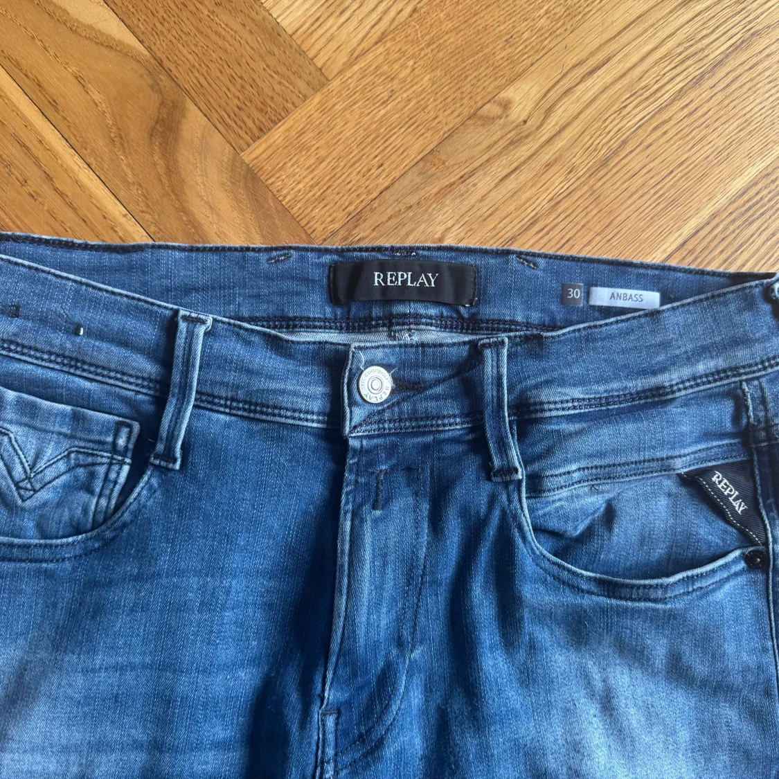 Säljer ett par snygga blå jeans från Replay i modellen Anbass. De har en klassisk femficksdesign och är i mycket bra skick. Perfekta för både vardag och fest! Storlek 30/32.