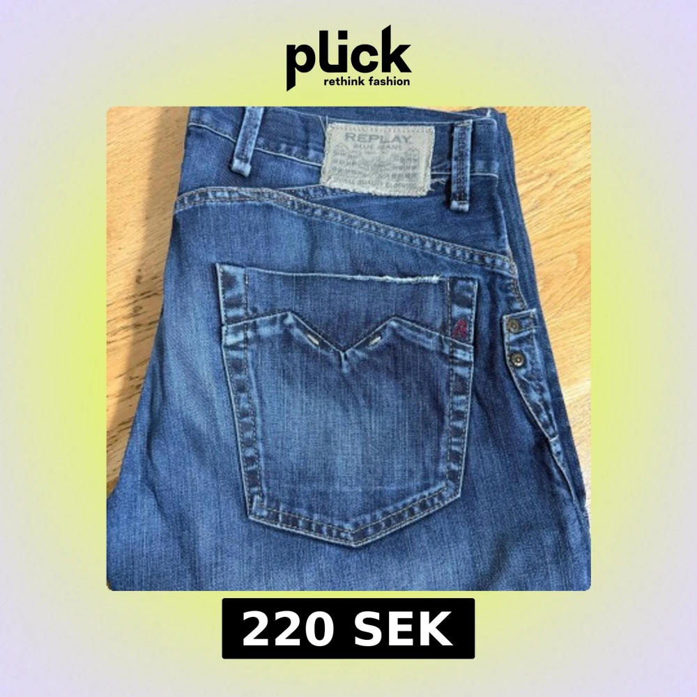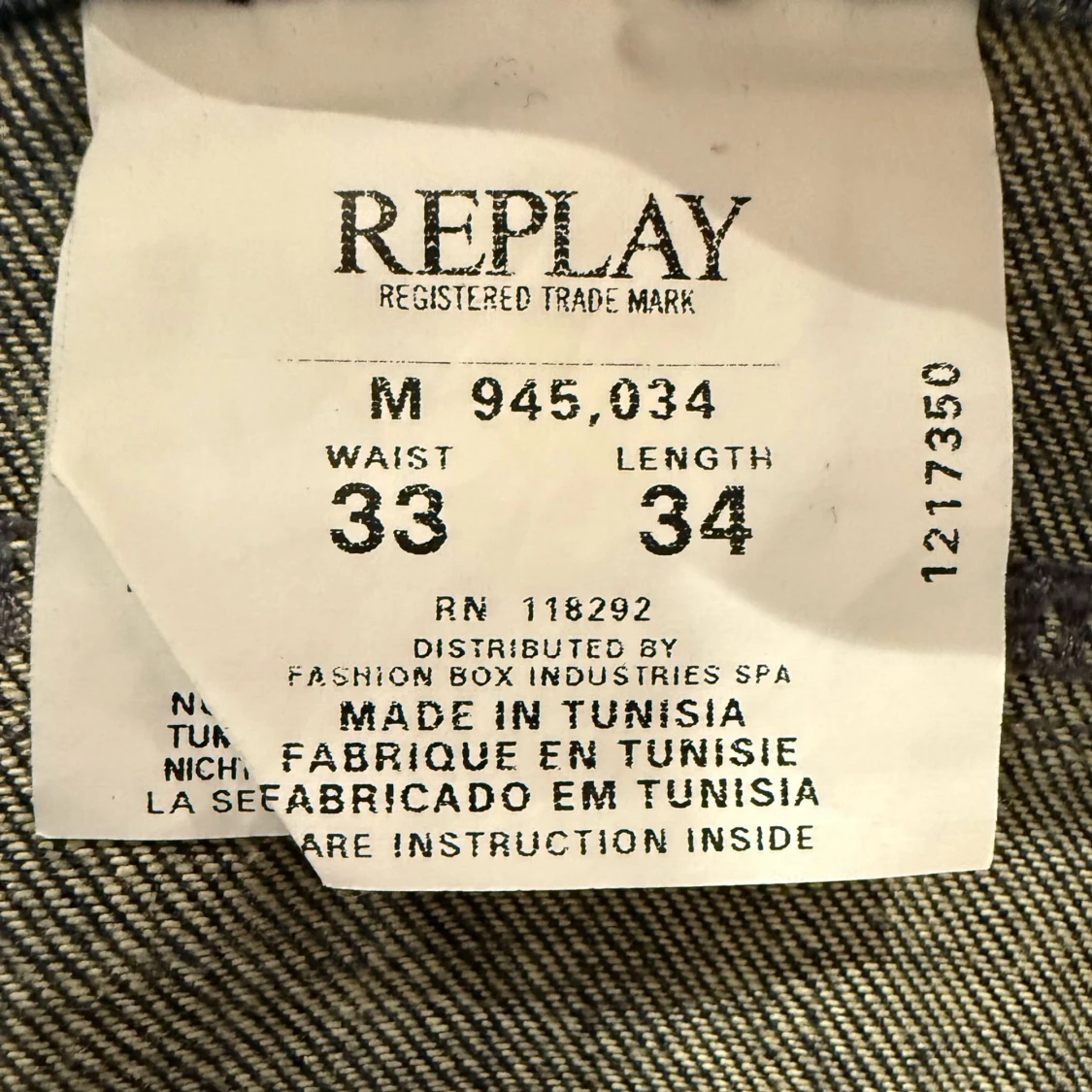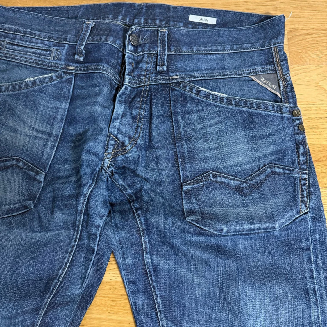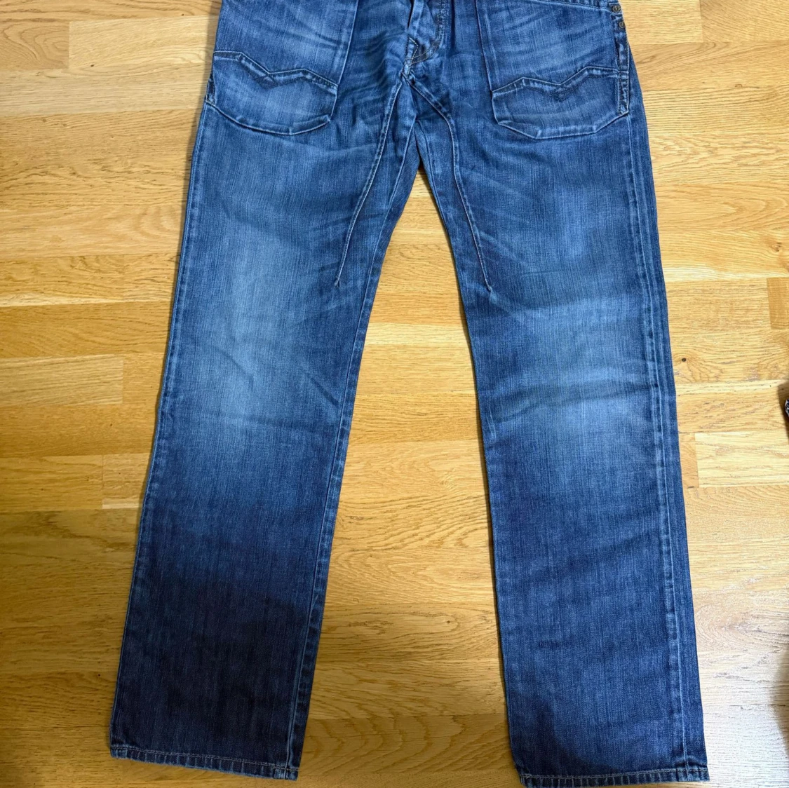 Säljer ett par klassiska blå jeans från Replay med raka ben och snygga slitningar. Byxorna har fem fickor, bälteshällor och tydliga Replay-detaljer på bakfickan. Midjemått W33 och längd L34.