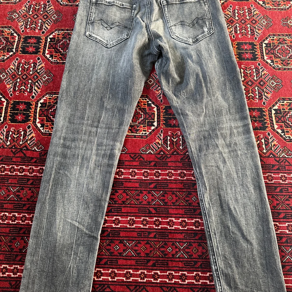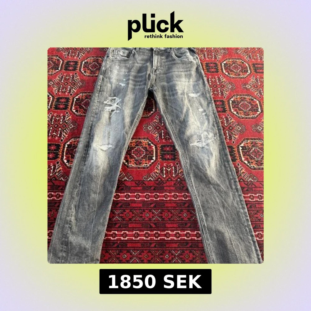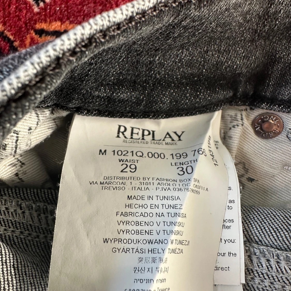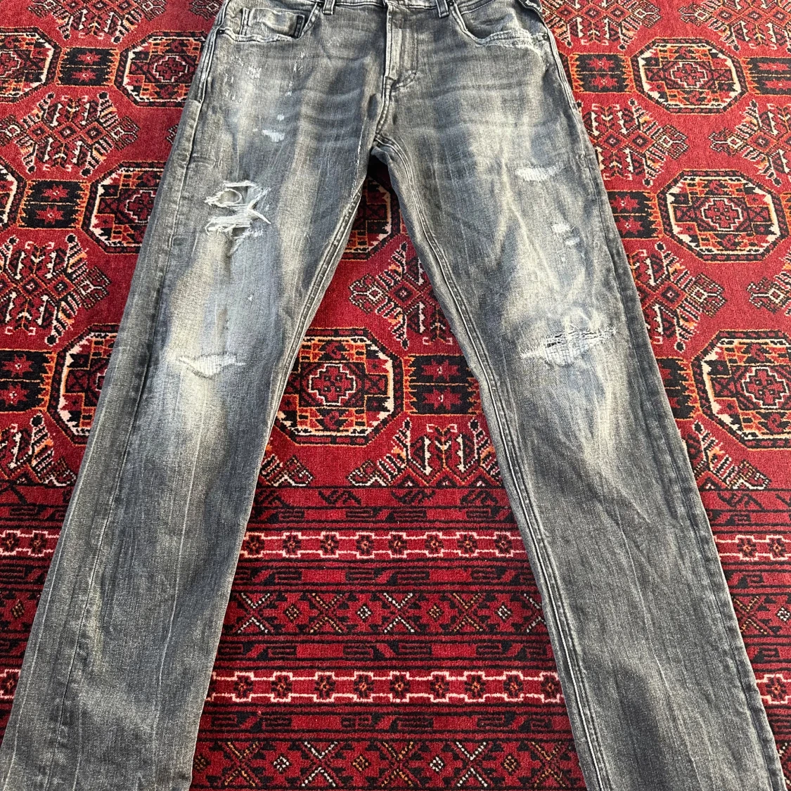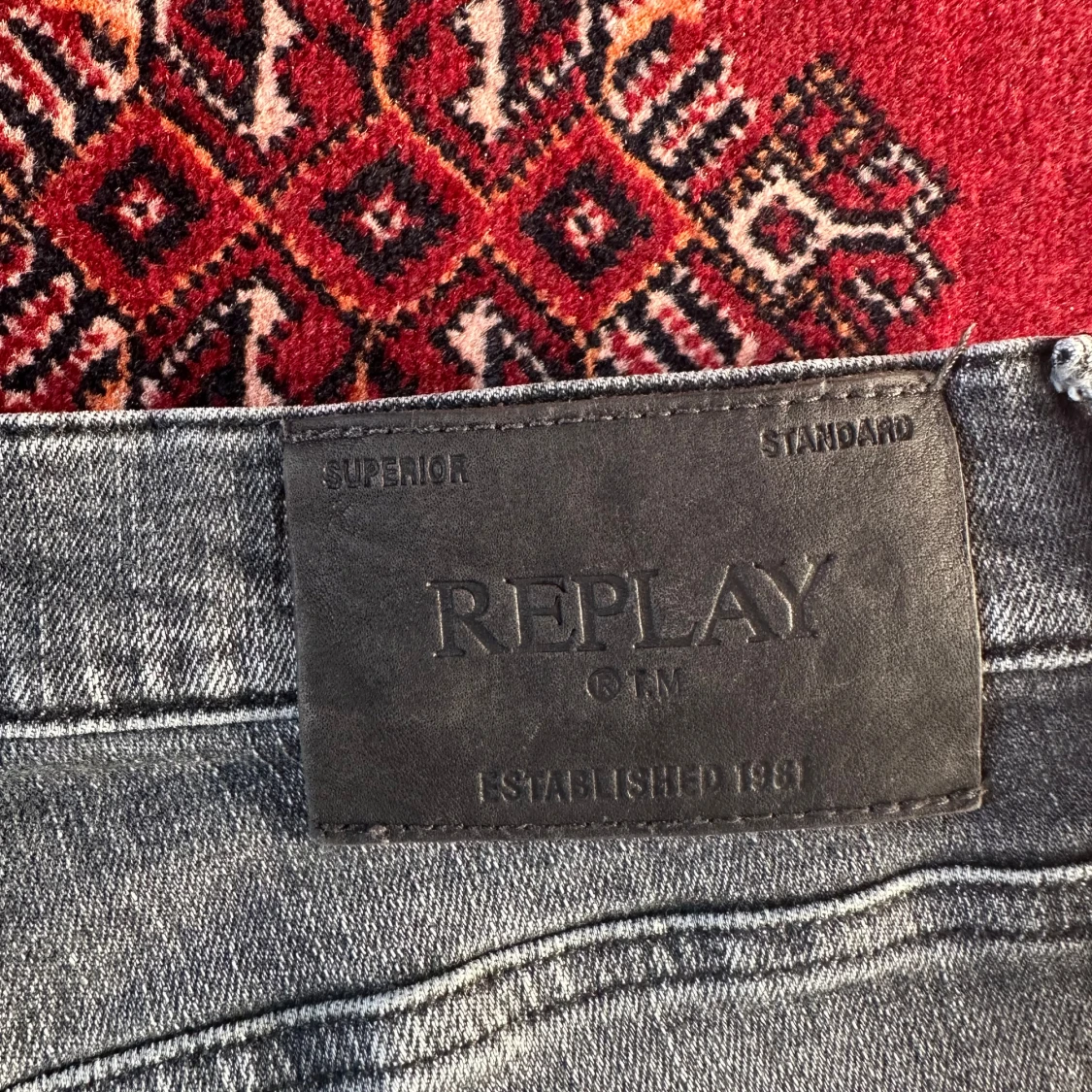 Säljer ett par gråa Replay jeans med slitna detaljer och raka ben. Byxorna har klassisk femficksdesign och tydliga slitningar framtill för en tuff look. Midjan är låg och passformen är normal. Perfekta för dig som gillar en avslappnad stil. Ordinarie pris (2,500kr)