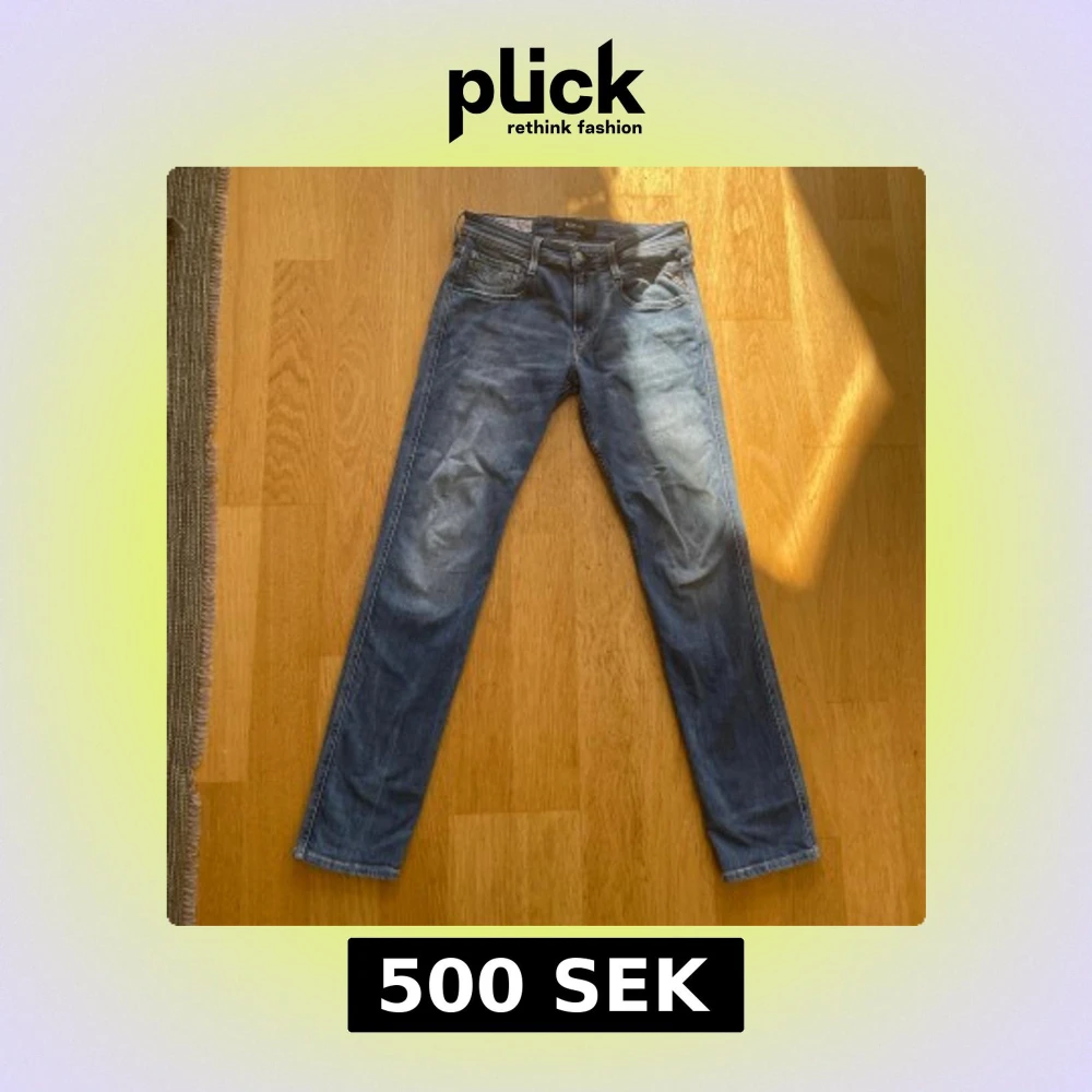 Säljer ett par klassiska blå Replay Anbass jeans med fem fickor och raka ben. Byxorna har snygga slitningar och en läderpatch med Replay-logga bak i midjan. Passar perfekt till vardags och har en tidlös look. Kan pruta!!!