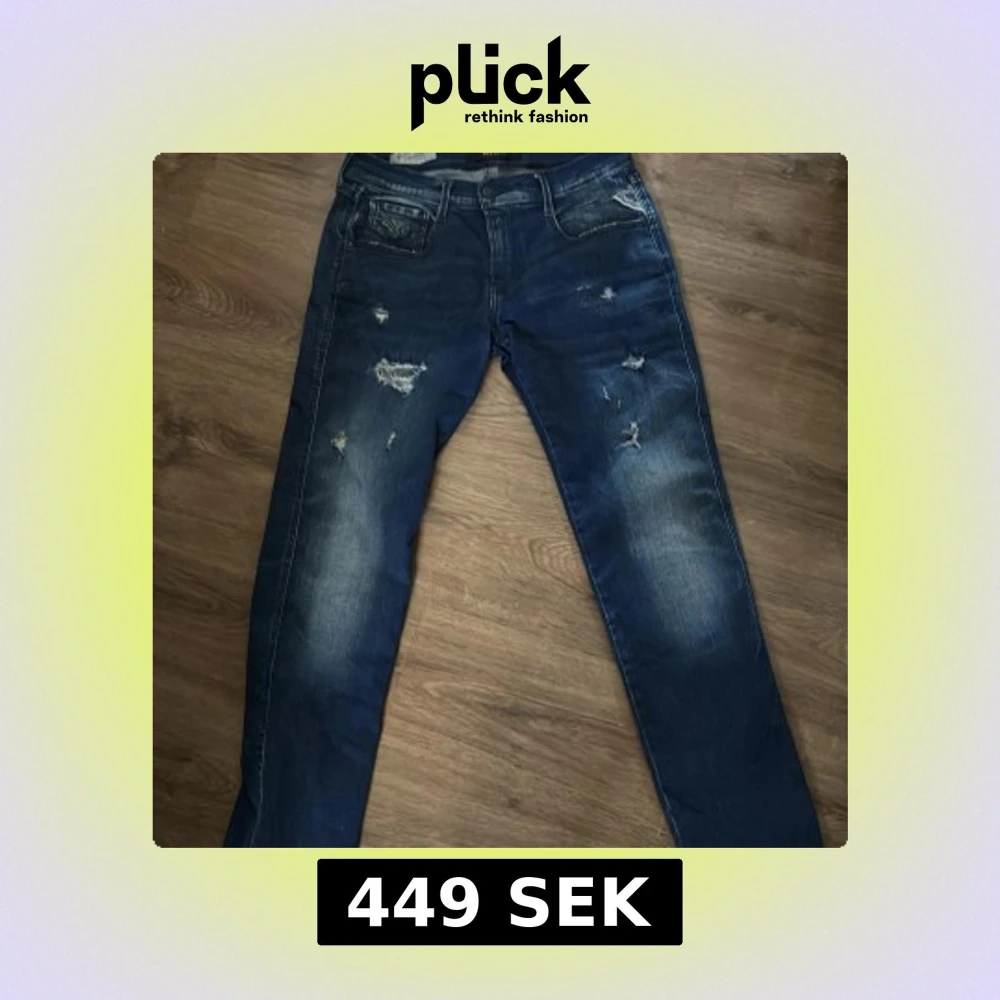 Säljer ett par Replay Hyperflex jeans i mörkblå tvätt med slitningar och snygga detaljer. Jeansen har klassisk femficksdesign, raka ben och stretchigt material för extra komfort. Perfekta för dig som gillar en avslappnad men trendig look.