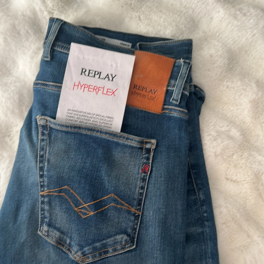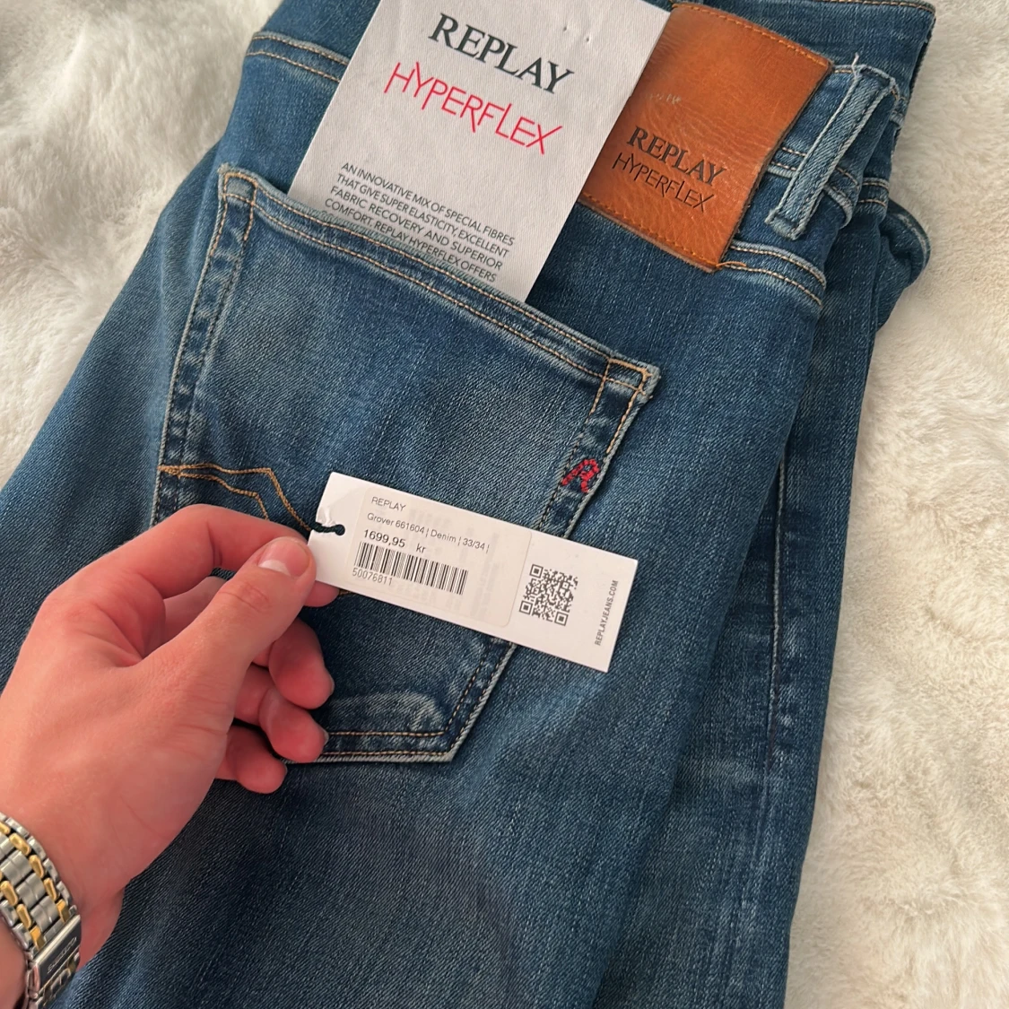 Säljer ett par Replay Hyperflex Grover jeans i klassisk blå tvätt. Jeansen har snygga kontrastsömmar, fem fickor och skön stretch. Modellen är rak med normal passform och har läderpatch med Replay-logga bak. Perfekta för dig som vill ha både stil och komfort. Kvitto och tags medkommer
