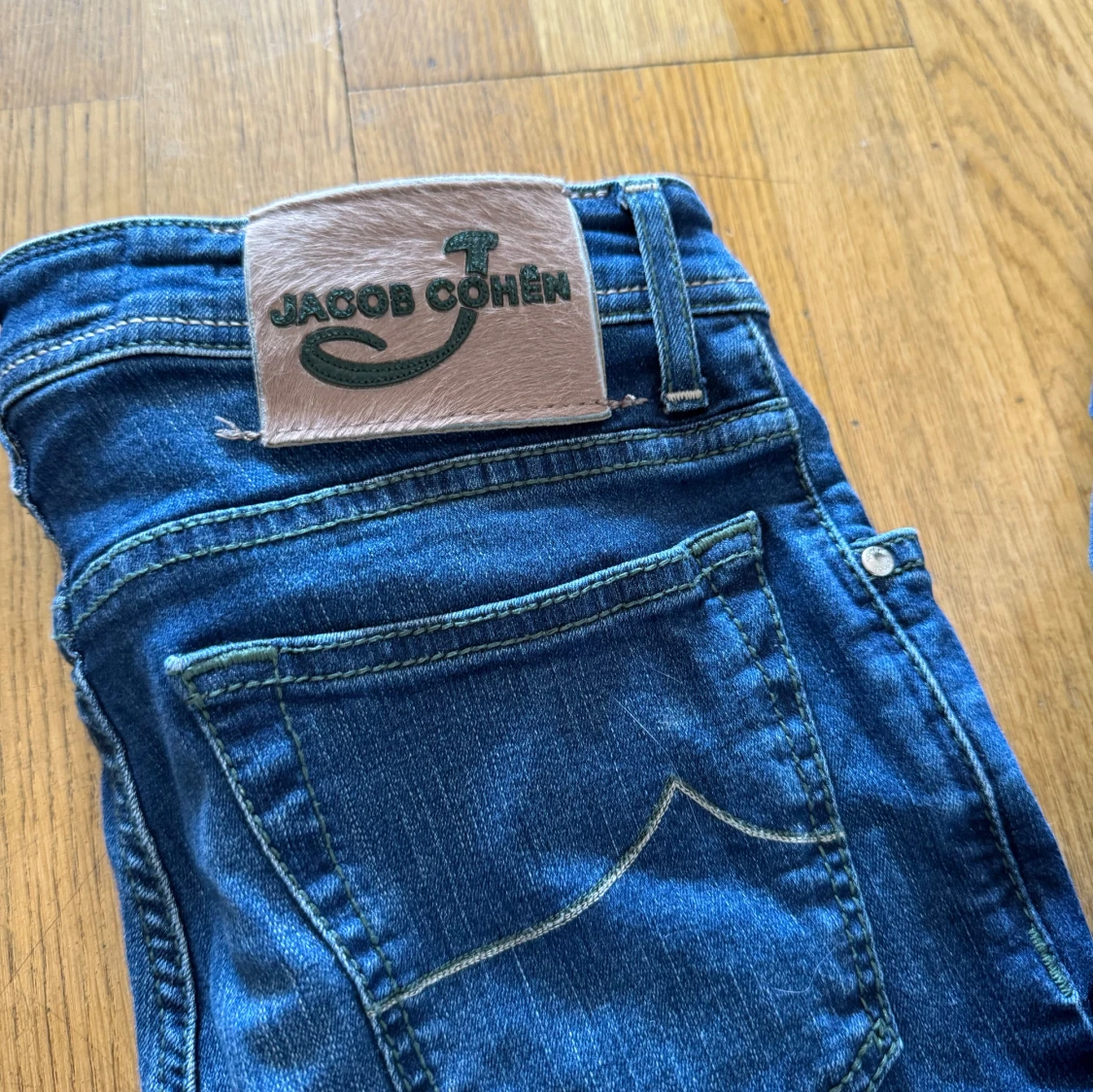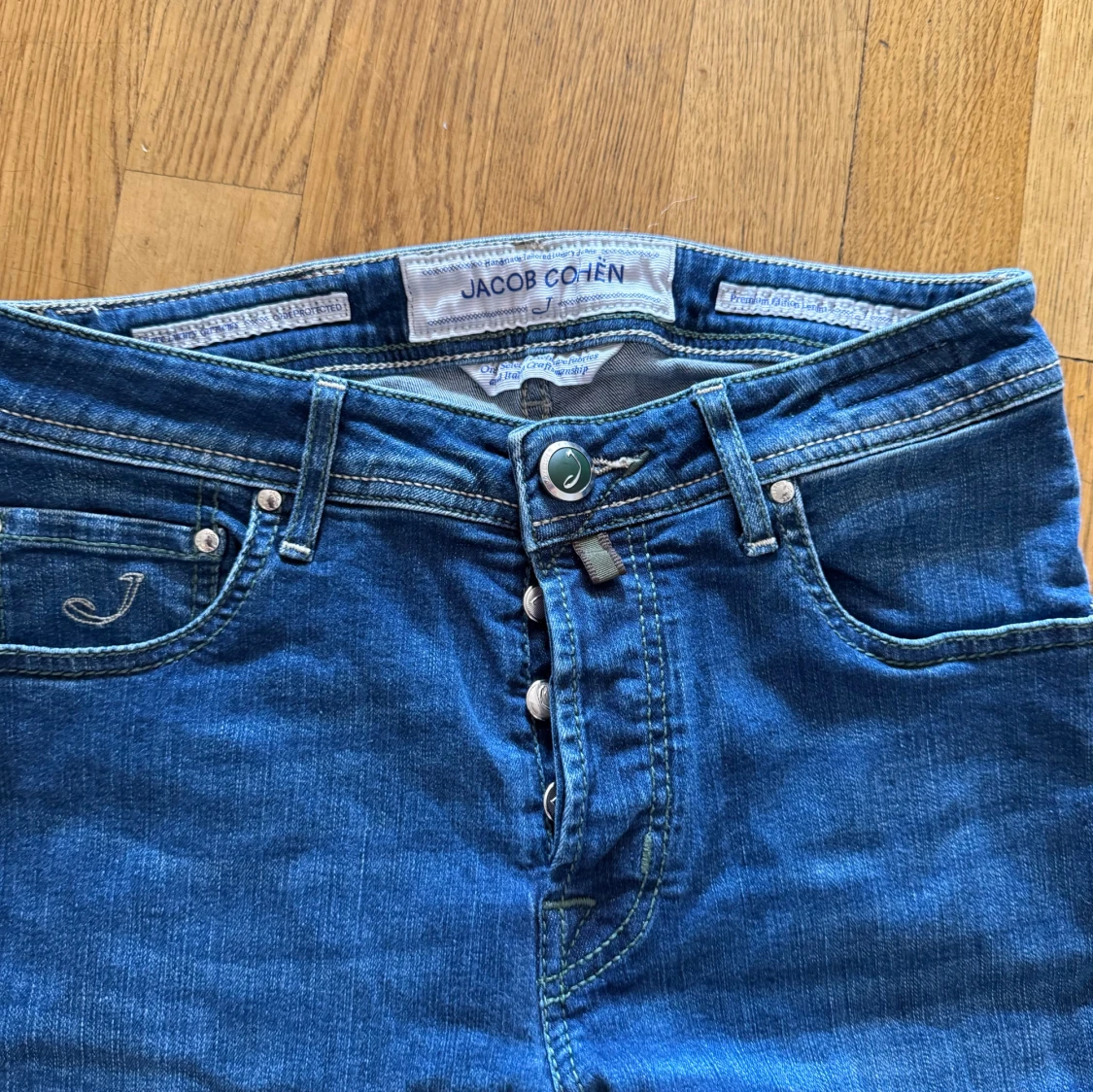Snygga blå jeans från Jacob Cohën med klassisk femficksdesign, gröna detaljer och logotyp på bakfickan. Jeansen har en normal passform och är tillverkade i mjukt denimtyg med knappgylf och stilren look.