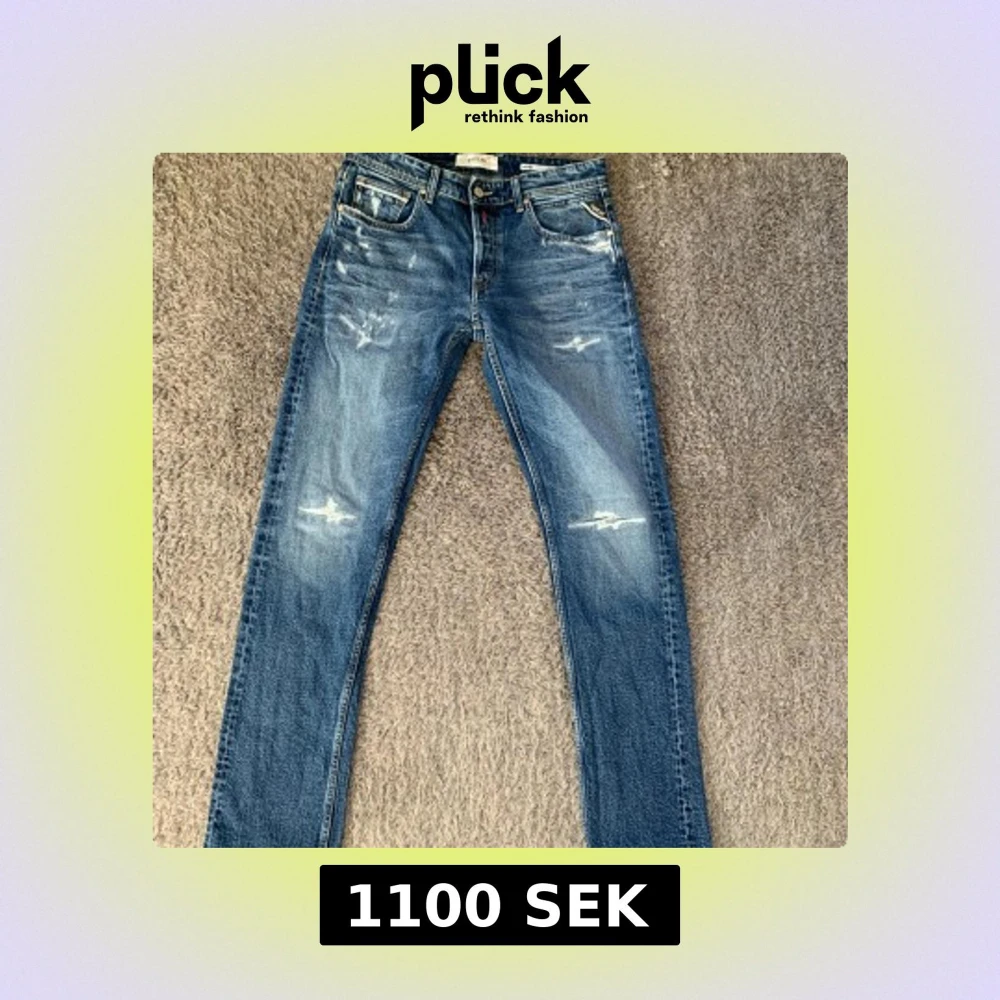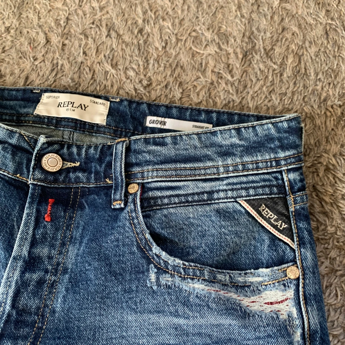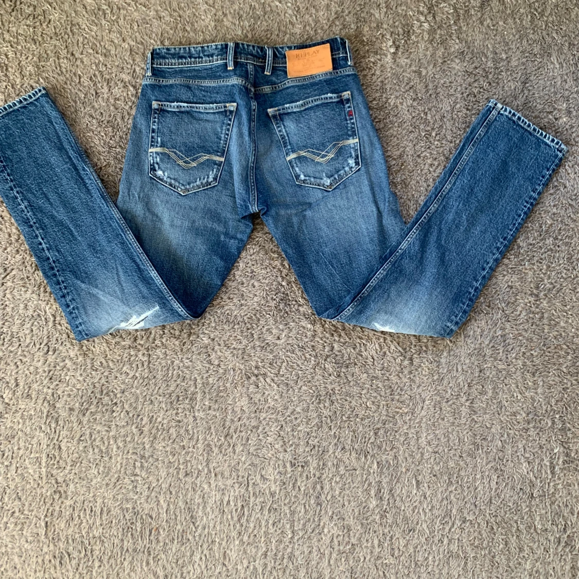 Snygga Replay Grover jeans i klassisk blå tvätt med slitna detaljer och raka ben. Jeansen har fem fickor, tydliga Replay-loggor och kontrastsömmar. Dom är i super bra skick och endast testade. Storlek W31 L32. priset är fast.