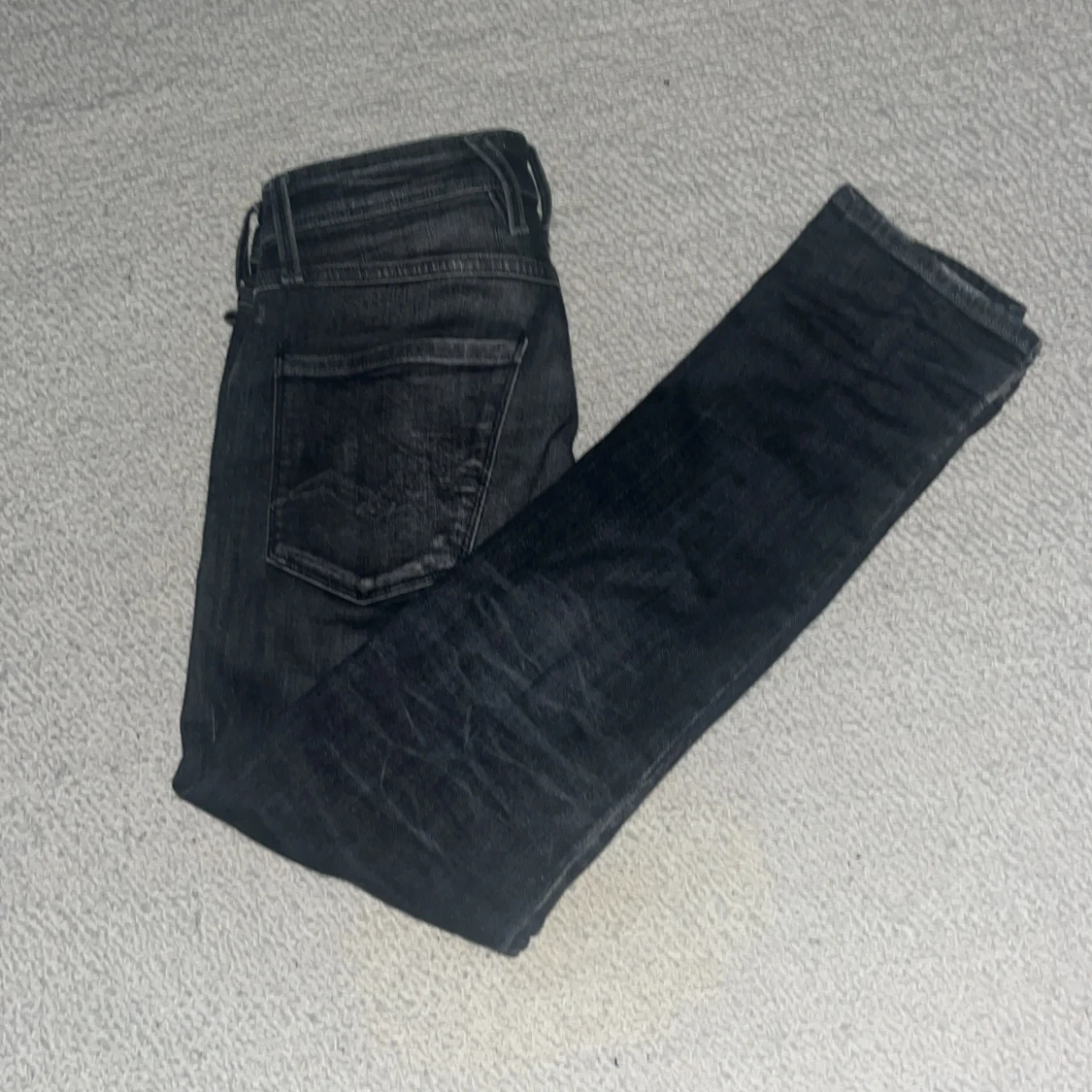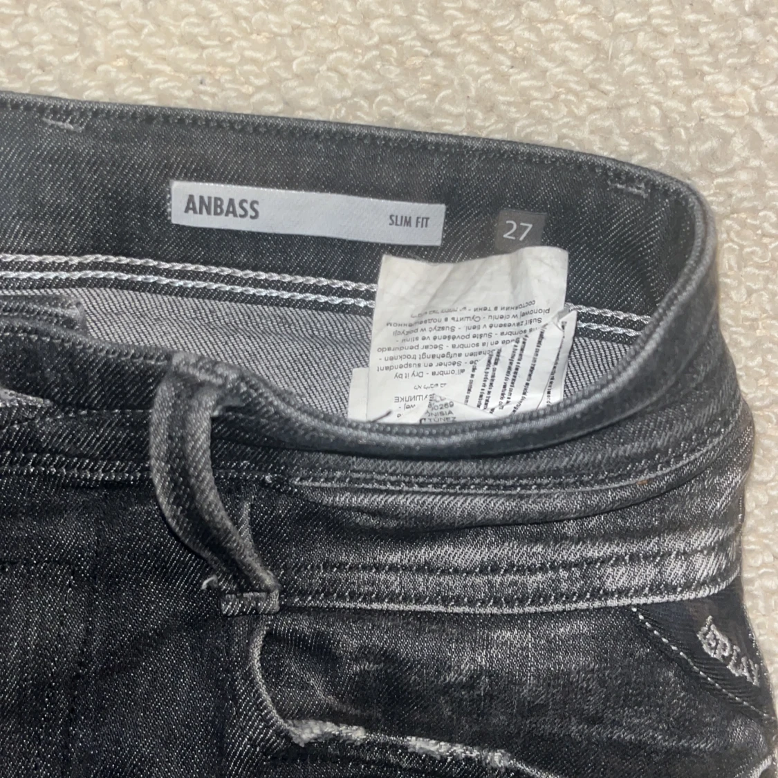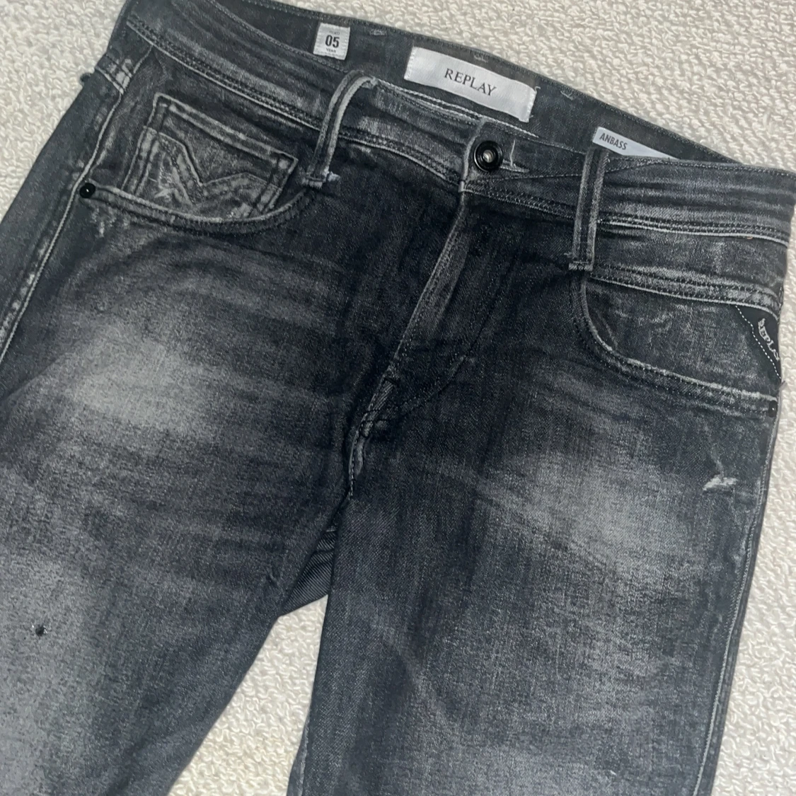 Snygga svarta Replay Anbass jeans i slim fit. De har en cool tvättad look med lätt slitna detaljer. Perfekta för en stilren och modern outfit. 🖤