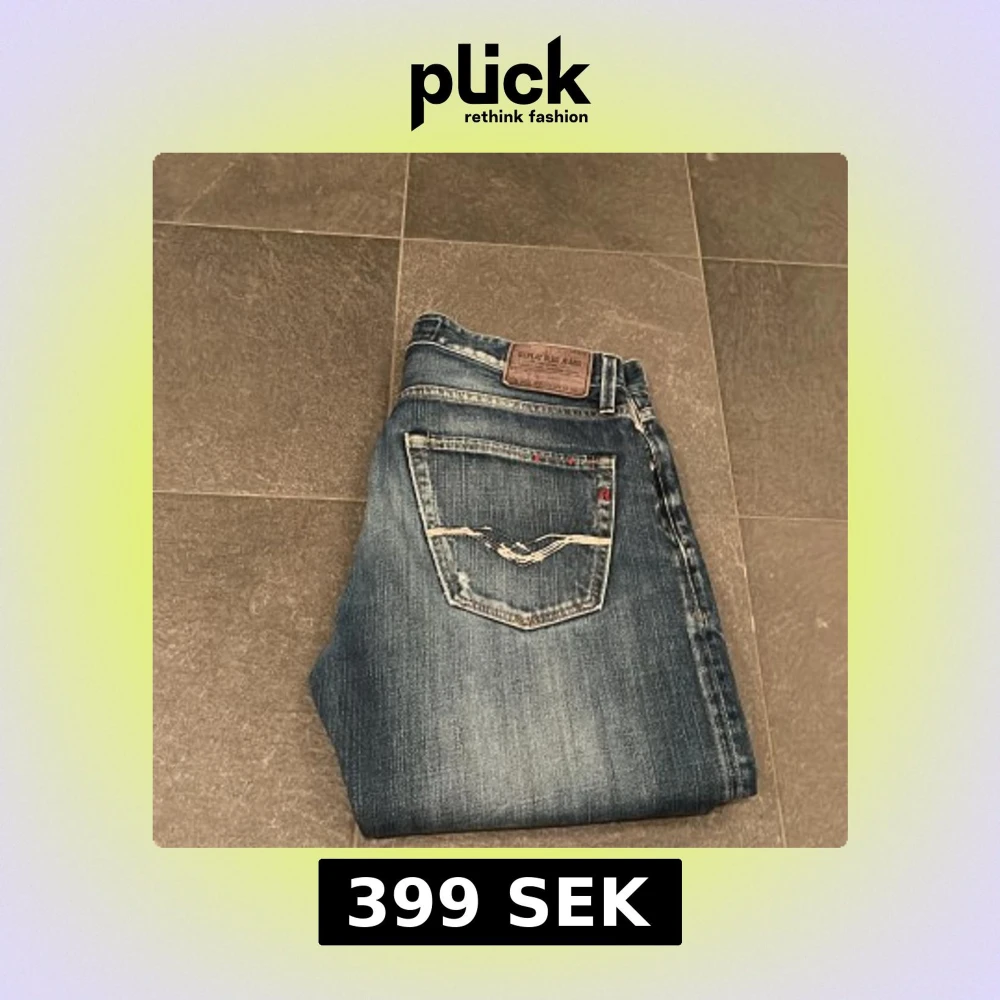 Snygga blå Replay jeans i straight fit med slitningar och coola detaljer på bakfickan. Storlek W 32 L34