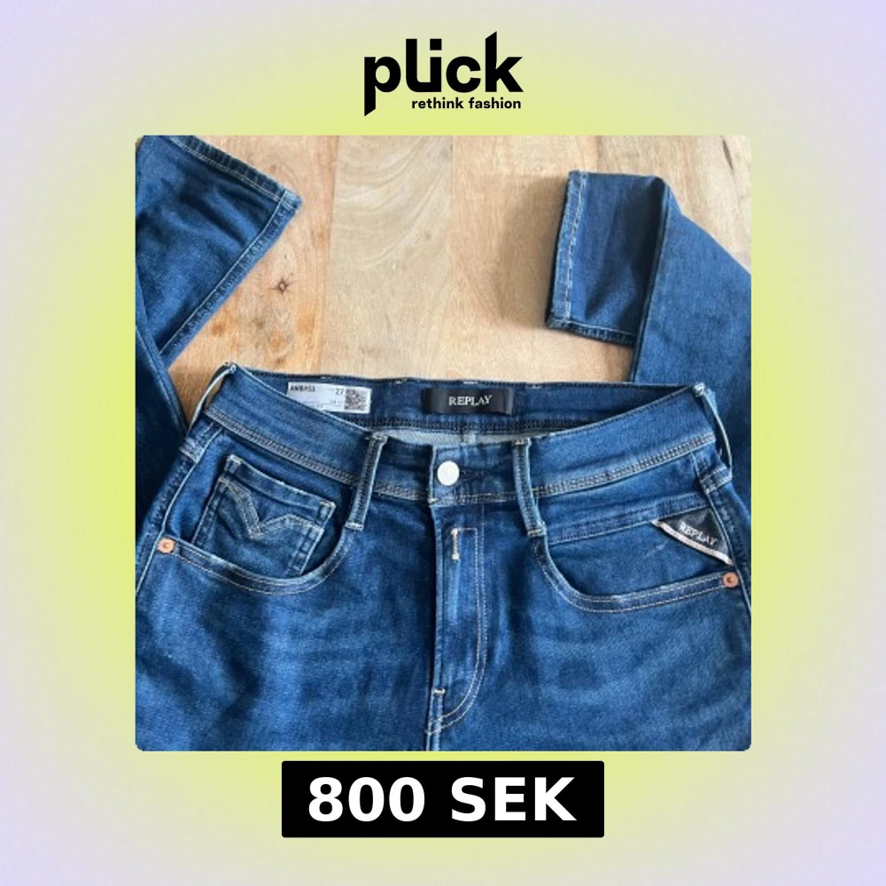 Snygga blå jeans från Replay Hyperflex-serien, modell Anbass. Slim fit med klassiska fem fickor och tydliga kontrastsömmar. Märkespatch bak ochReplay-logga på fickan. Perfekta för dig som gillar stretchiga jeans med modern passform. Jeansen har ett litet märke som du ser på bild 3 men det syns knappt. Köpta på jeansbolaget för 1800 kr.