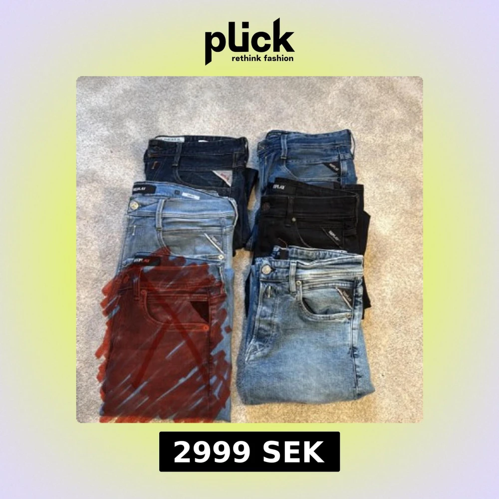 Säljer flera par Replay jeans. Dem svarta och ett par ljusblåa är Grover och dem andra 3 är Anbass. Jeansens storlek är mellan Waist 27-33 och längd 34. Vid minsta lilla fundering är det bara att kontakta mig!