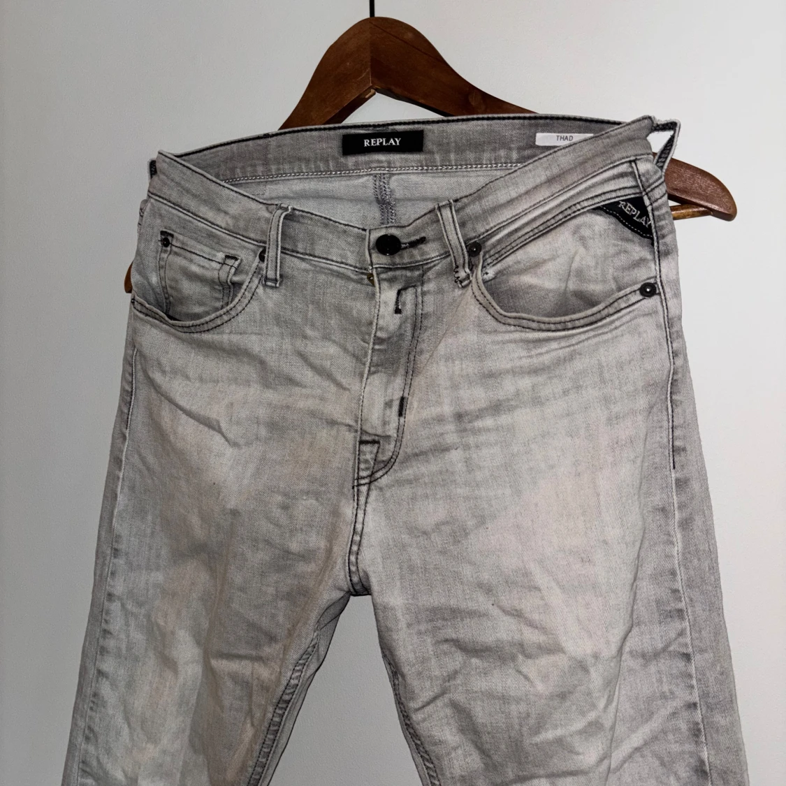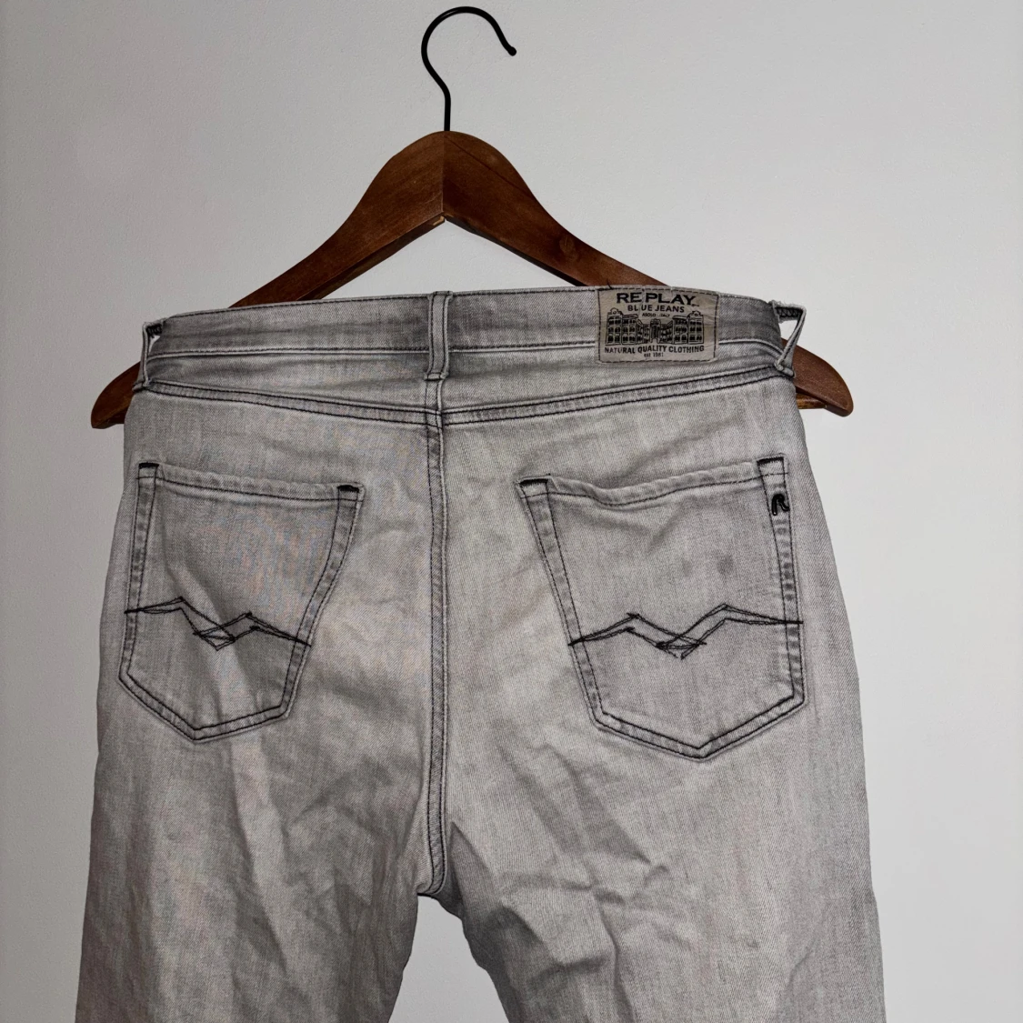 W30 L30 Snygga grå jeans från Replay med raka ben och klassisk femficksdesign. Jeansen har svarta kontrastsömmar och Replay-logga på bakfickan. Tillverkade i mjukt jeanstyg som sitter skönt hela dagen. Fickan har blivit modifierad för att man ska kunna få plats med mer. Nypris ligger runt 800 kronor.
