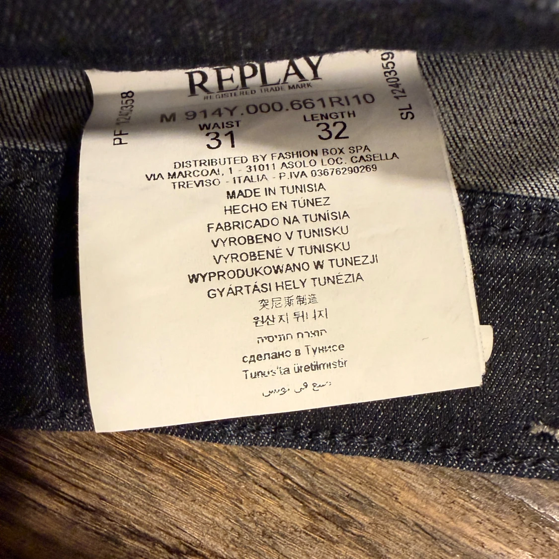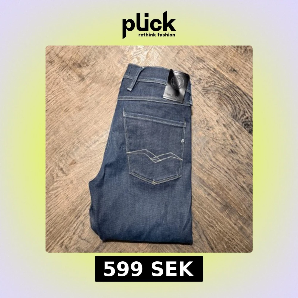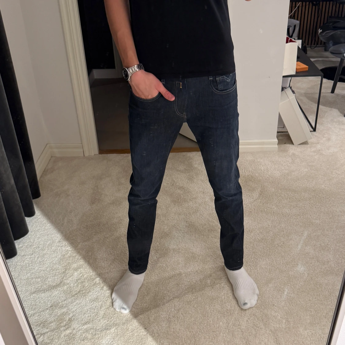 Säljer ett par mörkblå Replay Anbass jeans med klassisk femficksdesign och snygga kontrastsömmar på bakfickorna. Jeansen har en slim passform och är tillverkade i mjukt denimtyg som sitter skönt hela dagen. Jeansen är i bra skick men har en defekt brevid bakfickan på första bilden. Nypris: 1699
