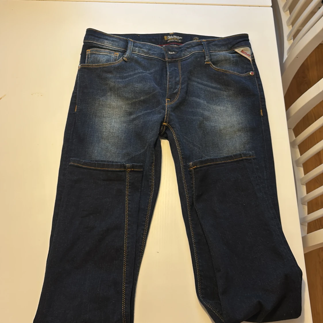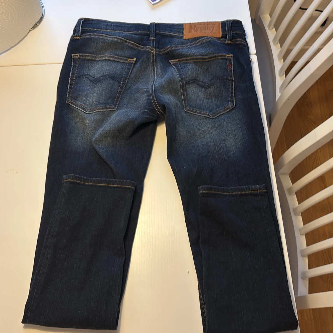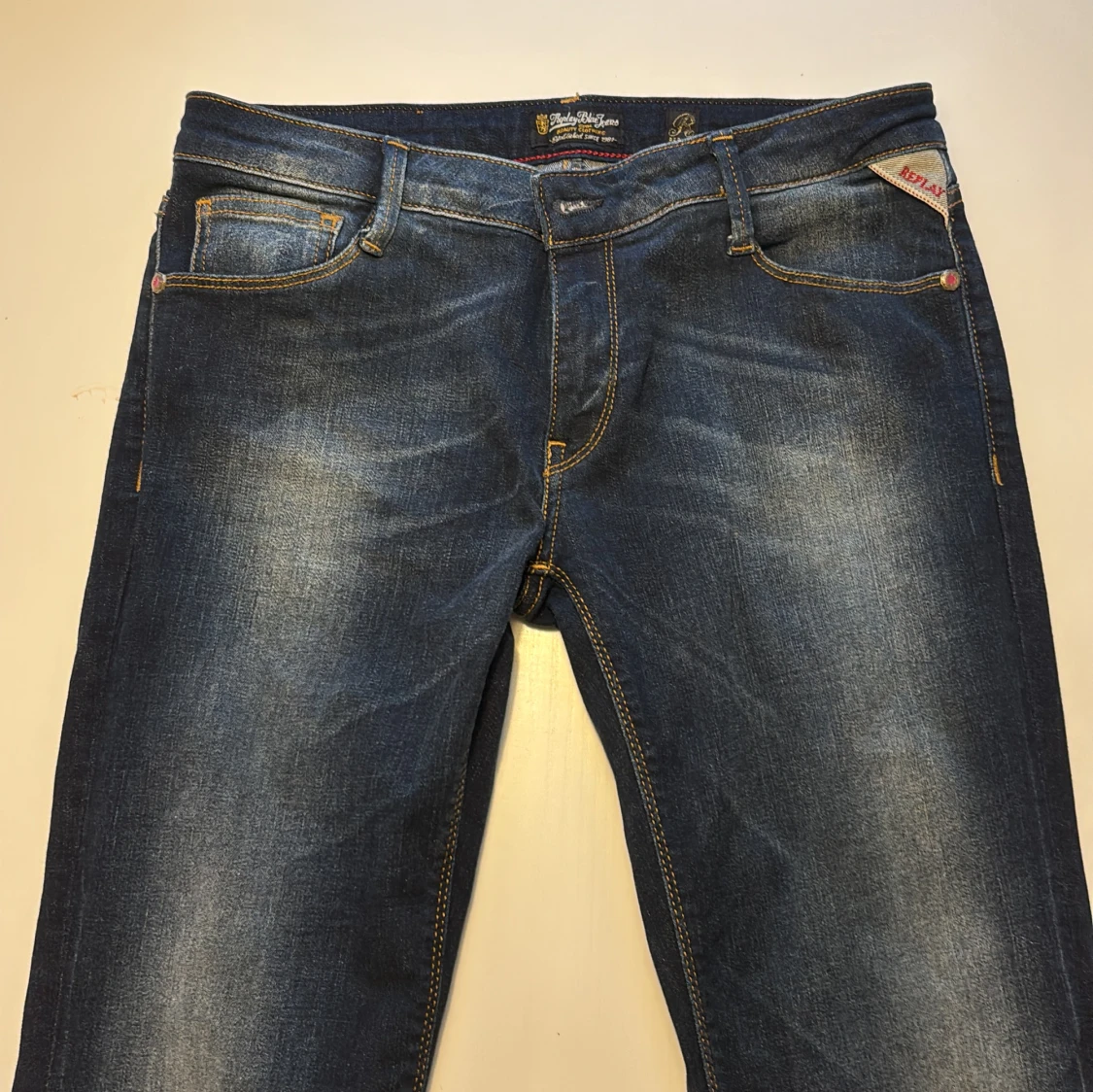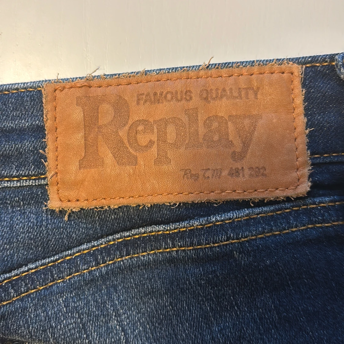 Snygga Replay jeans i mörkblå tvätt med slitningar och kontrastsömmar. Klassisk femficksmodell med raka ben och detaljerade bakfickor. Jeansen har en skinnpatch med Replay-logga bak i midjan och är tillverkade i robust denim.
