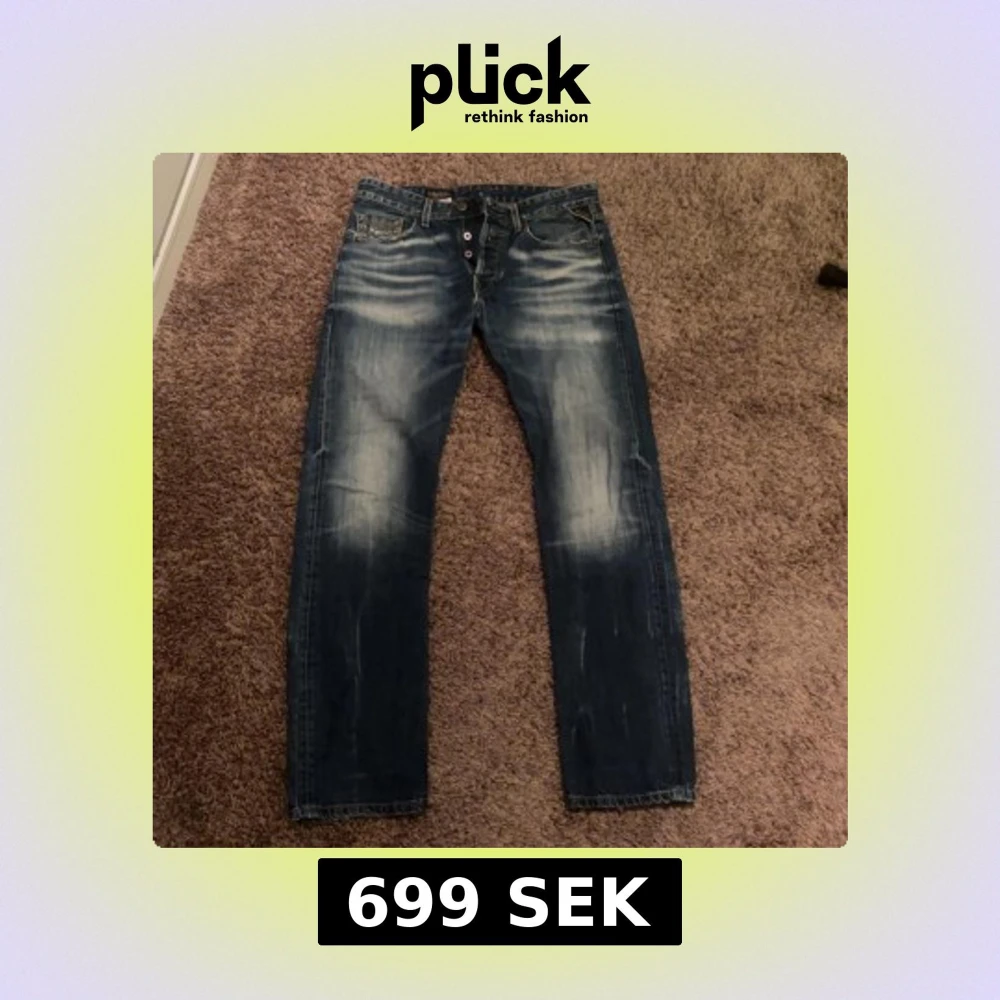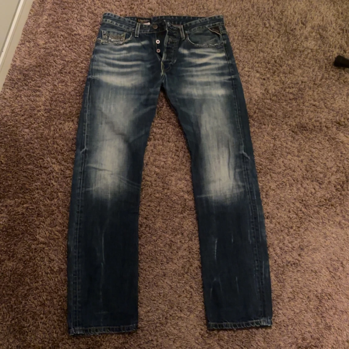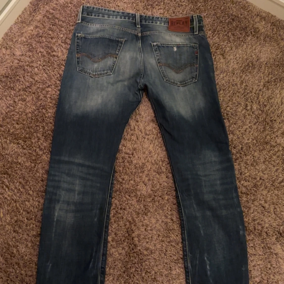 Blåa replay jeans med slitningar slitna detaljer i stl 32 passar 180-190 skulle jag säga. Fråga på och ge gärna prisförslag