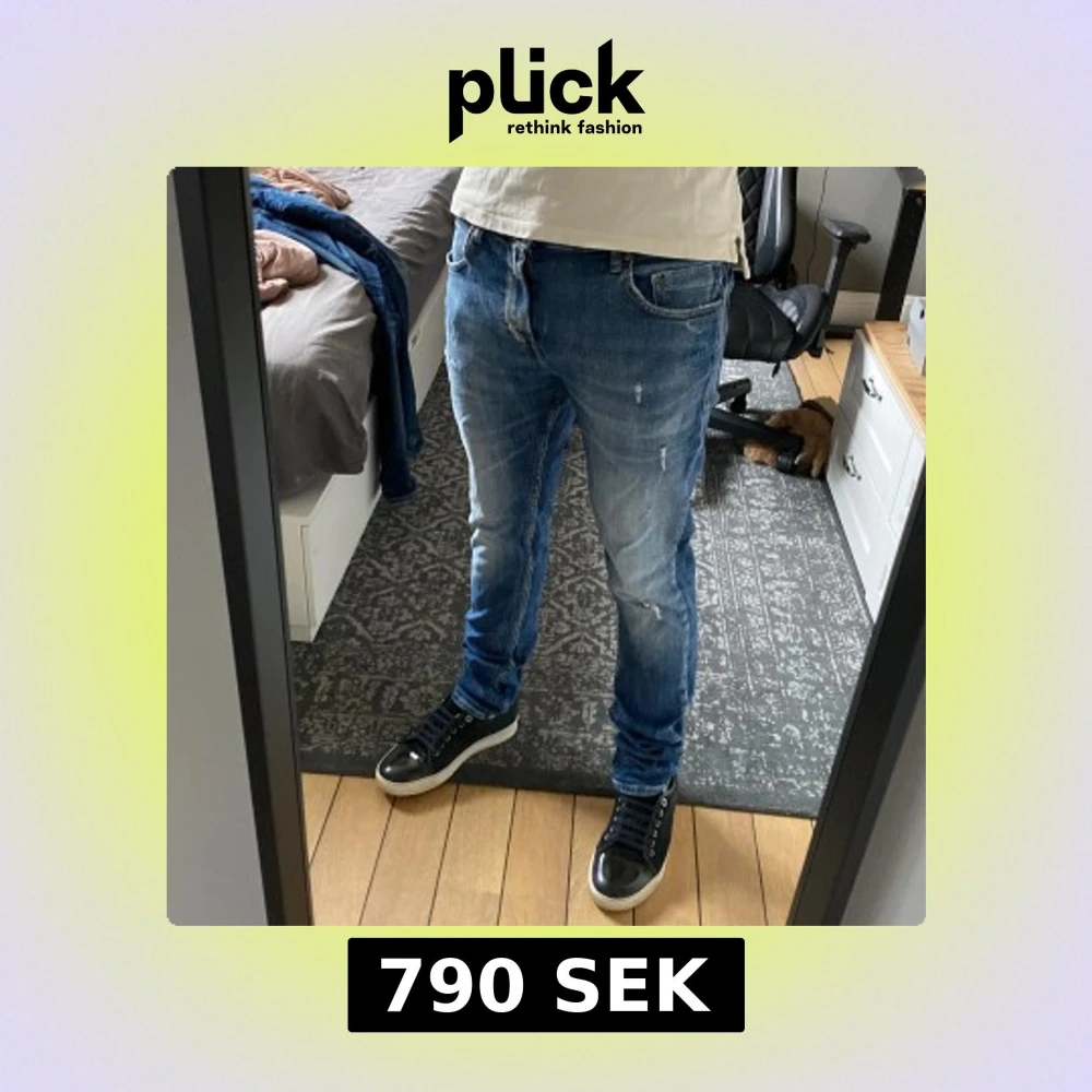 Snygga blå jeans från Replay med en slim tapered passform. Storlek 28/32 och sitter som anbass modellen. Kan skicka bild på hur de sitter!De har en klassisk femficksdesign och slitna detaljer för en trendig look. Perfekta för en avslappnad stil.