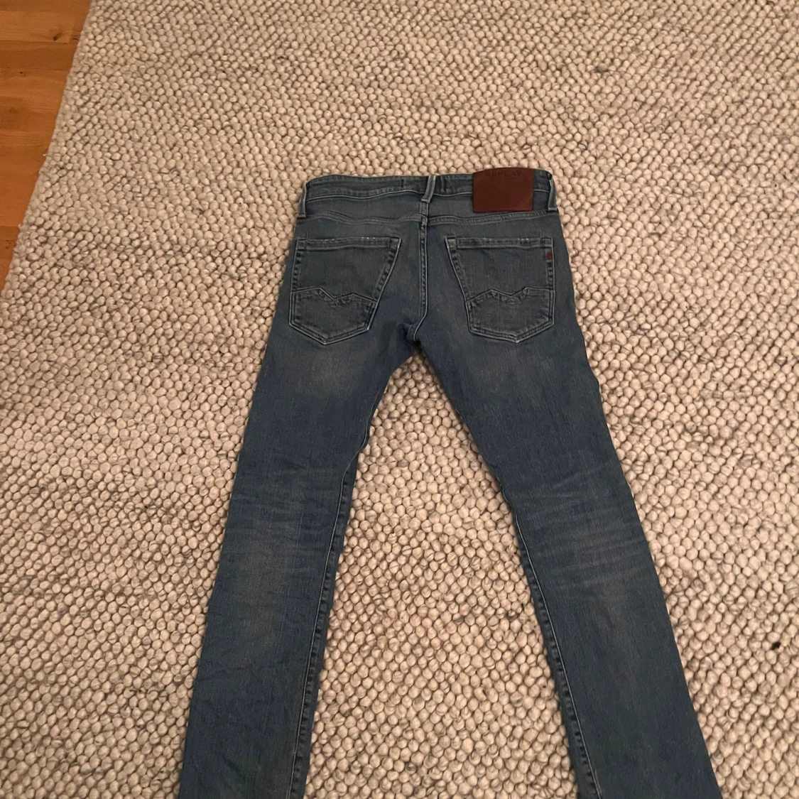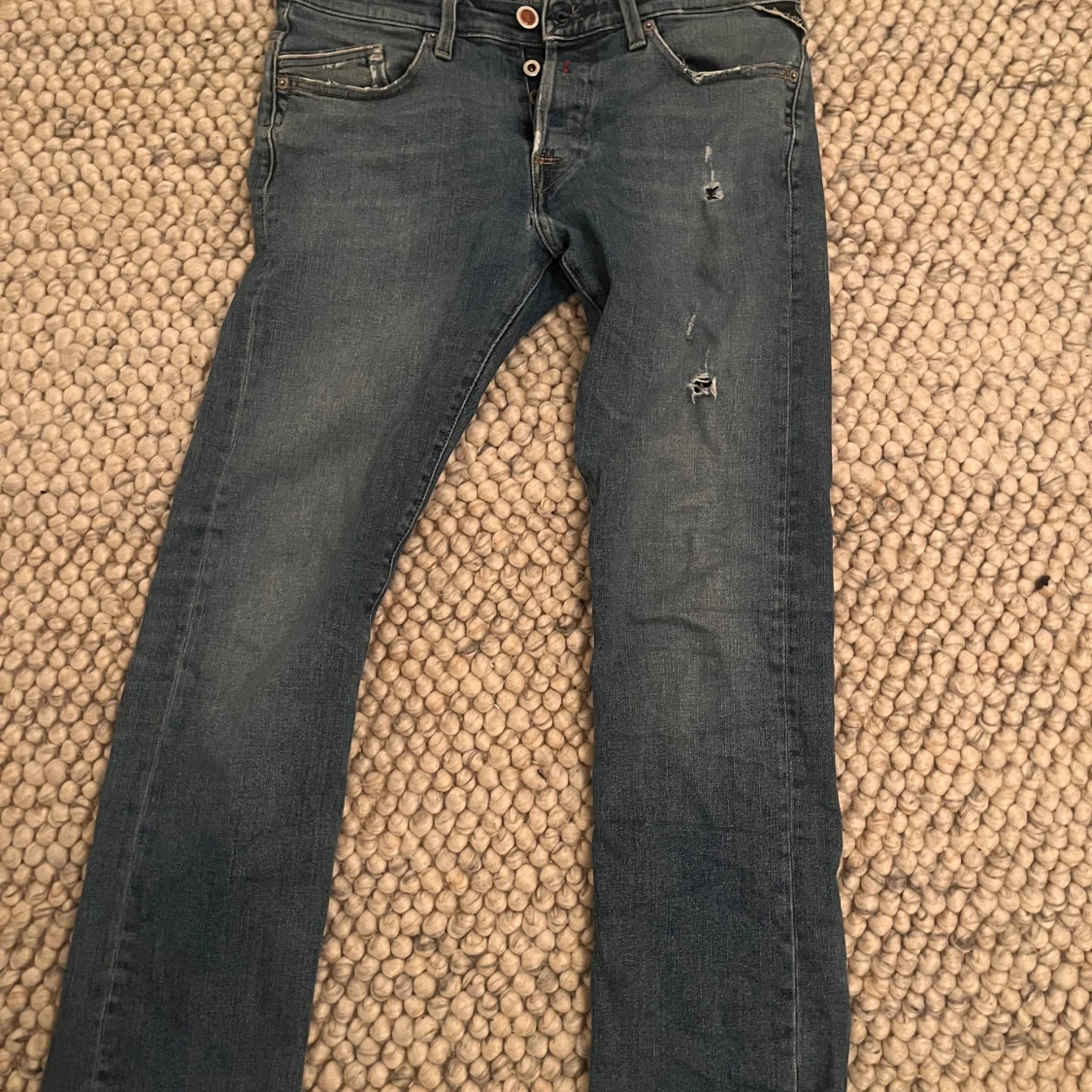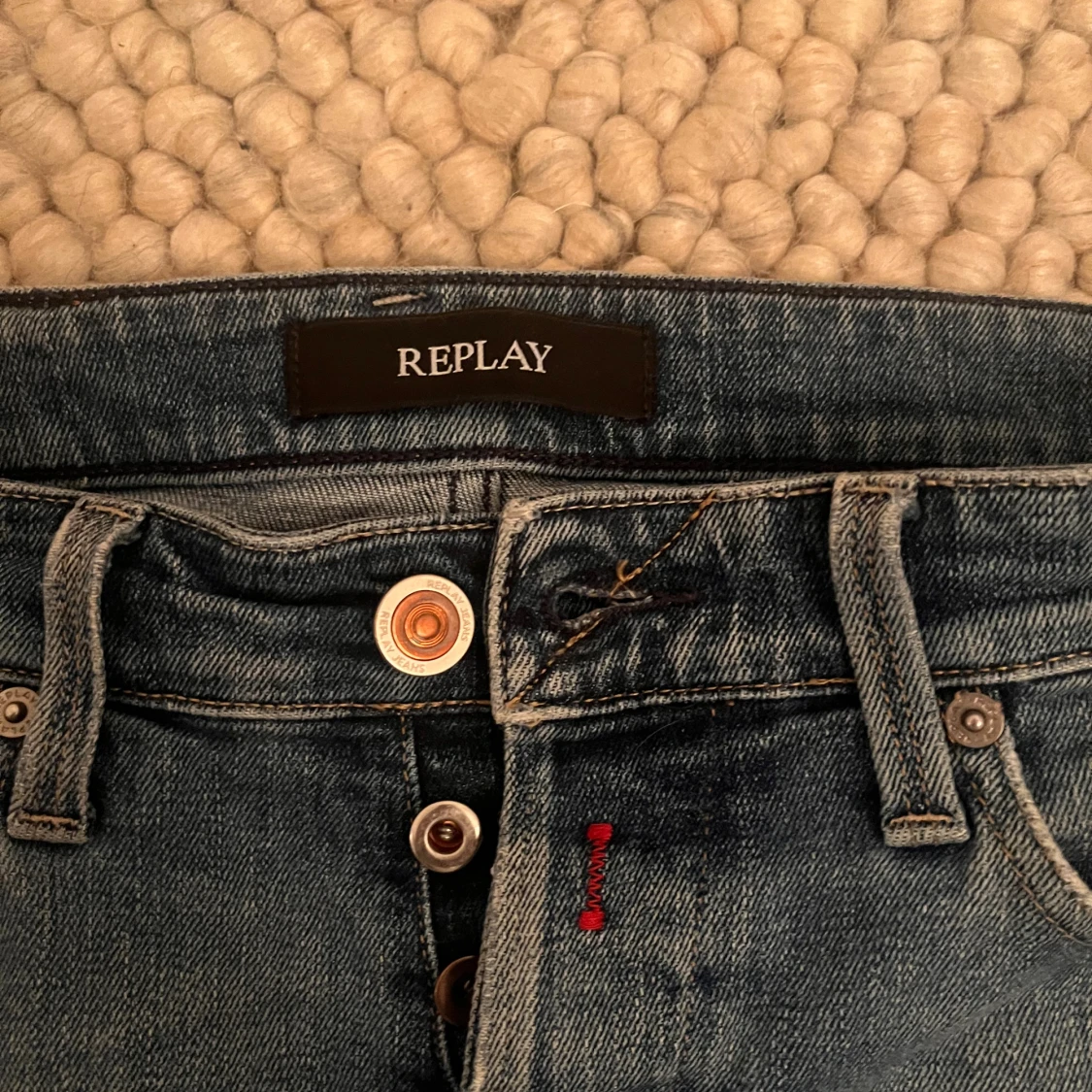 Replays jeans med små slitningar och små röda detaljer vilket gör jeansen riktigt feta! Priset går att diskutera! OBS ett litet hål under knapparna i skrevet men det märks knappt!