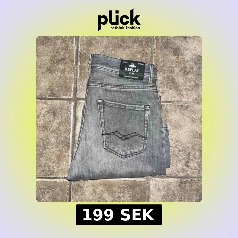 Snygga grå jeans från Replay med klassisk femficksdesign och raka ben. Jeansen har en cool tvättad look och svarta detaljer på bakfickorna. Passar dig som gillar stilrena och tidlösa jeans med lite edge. Storlek 142cm vilket jag bedömer till W26 L26 men utgå ifrån måtten. Midja 32cm, längd 83cm. JAG SKICKAR EJ FLER BILDER NÄR JAG BÄR JEANSEN! för storleksguide hänvisar jag till måtten och för bättre inblick i passformen rekommenderar jag att googla på modellnamnet. kolla måtten noggrant :) 43