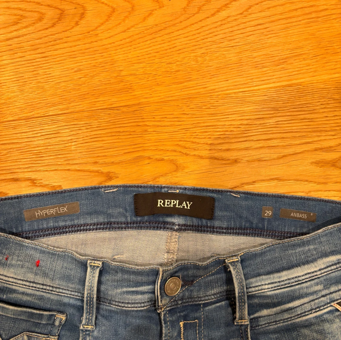 Säljer ett par snygga blå jeans från Replay i modellen Anbass Hyperflex. De har en slim passform och är i mycket bra skick. Storleken är 29/30. Skriv om ni har några frågor eller funderingar!