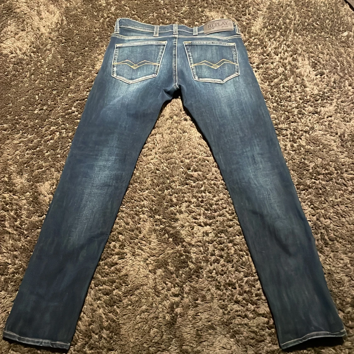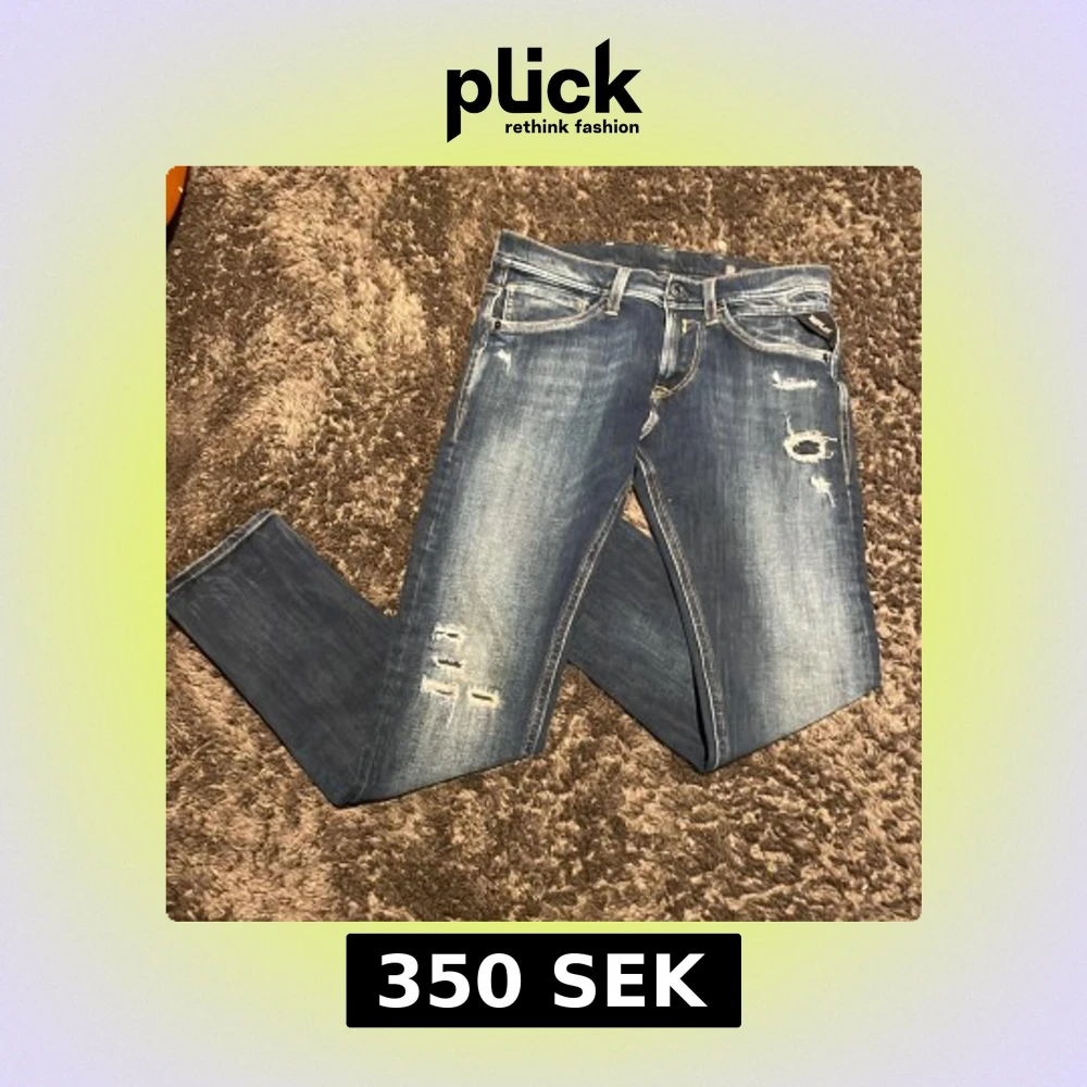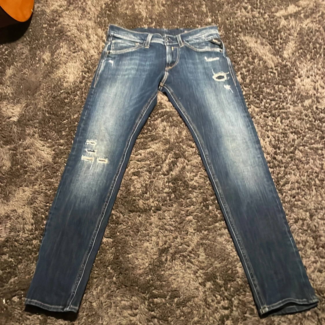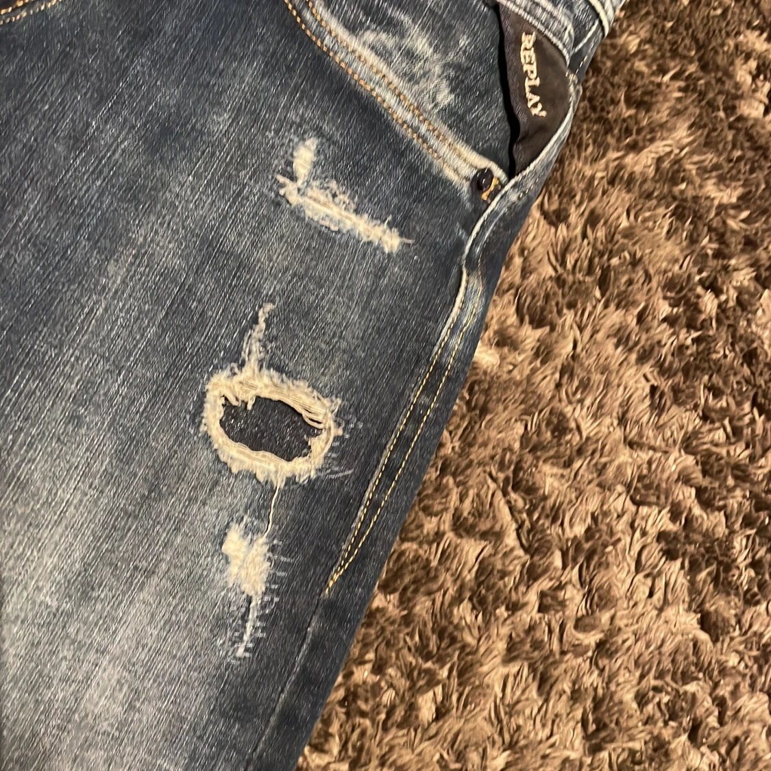 Mörkblå jeans med feta slitningar från replay. Är lite små i storleken. PRIS KAN DISKUTERAS.