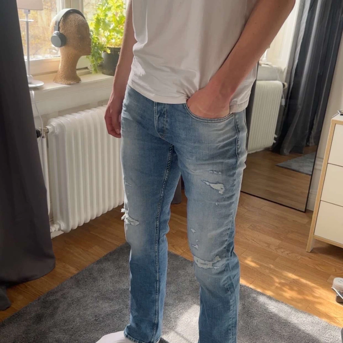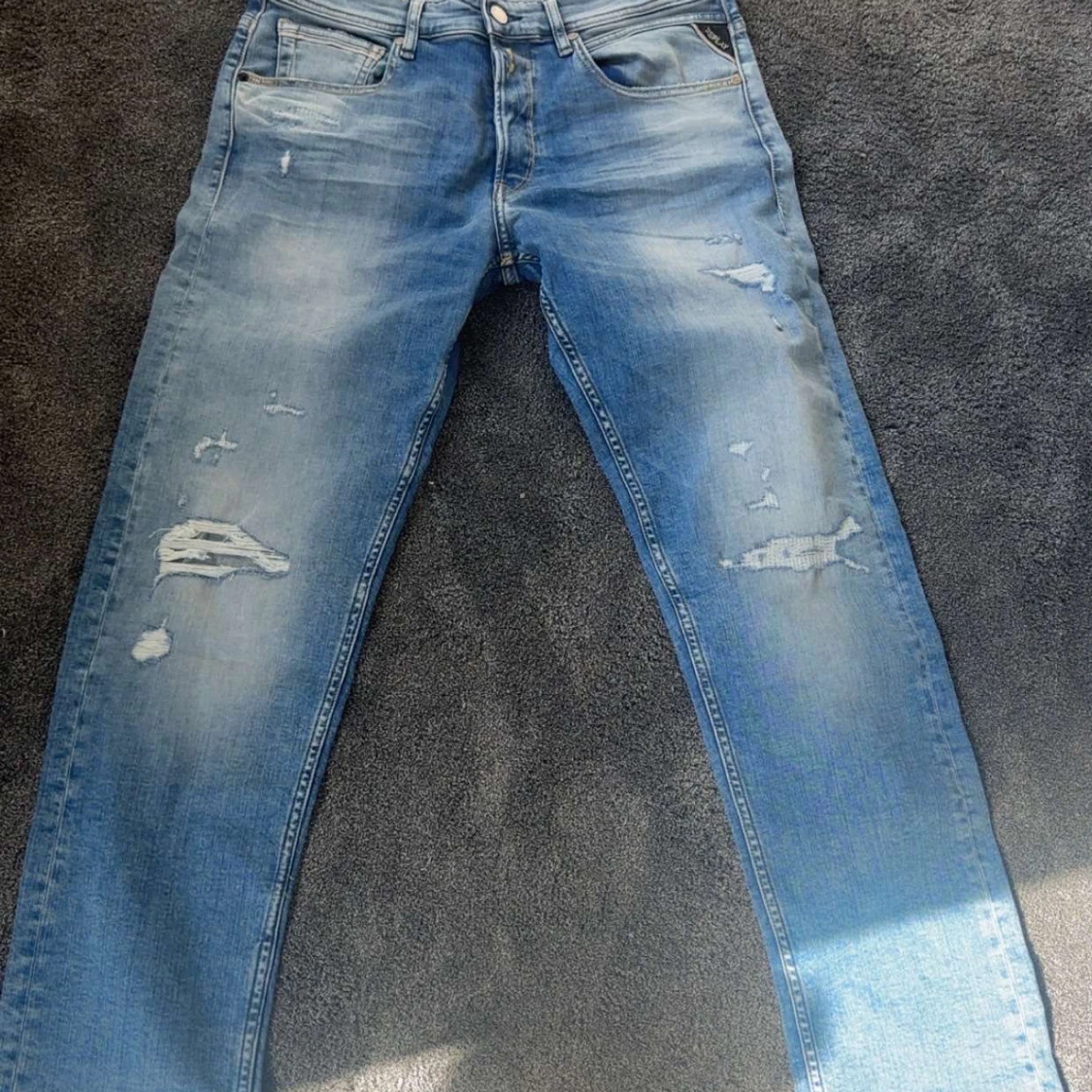 Säljer ett par replay jeans i ljusblå tvätt med slitningar och distressed detaljer på benen. Jeansen har normal passform, raka ben och klassisk femficksdesign. W 31, L 34. Helt nya
