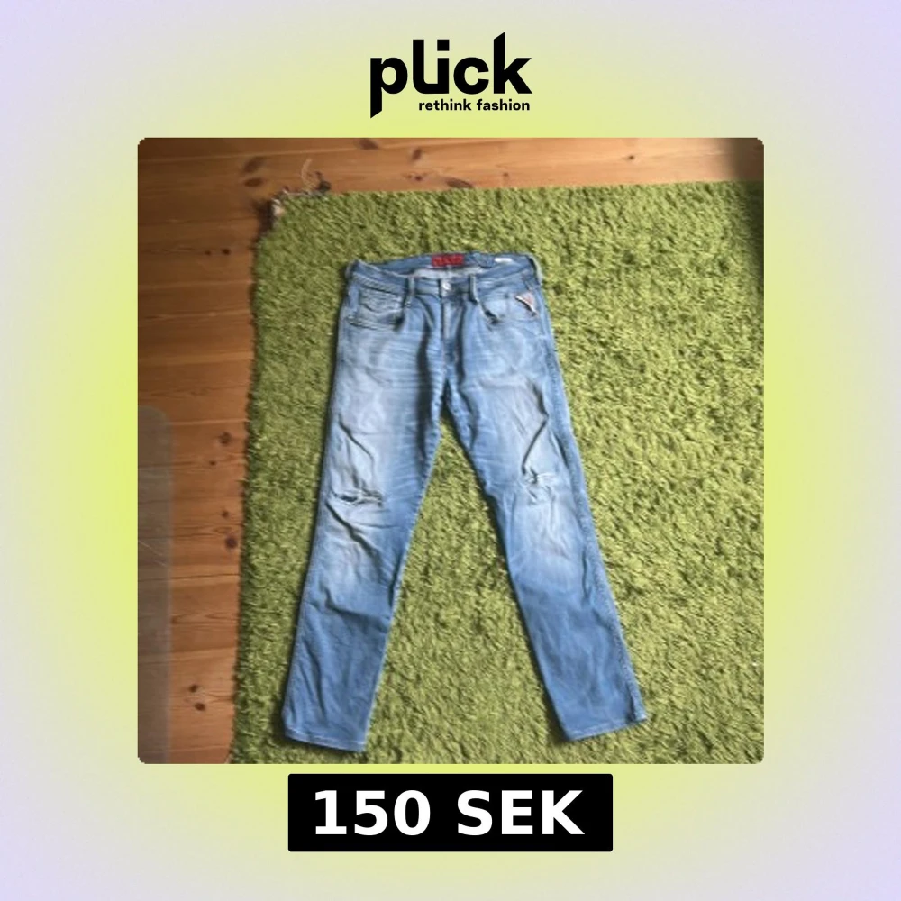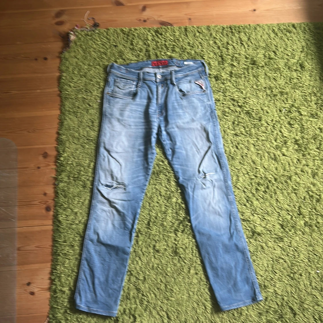 Säljer ett par snygga ljusblå jeans från Replay i modell herr, storlek 32/34. Jeansen har slitningar vid knäna, klassisk femficksdesign och är tillverkade i bomull med en skön jeanskänsla. Perfekta för dig som gillar en avslappnad och trendig look.
