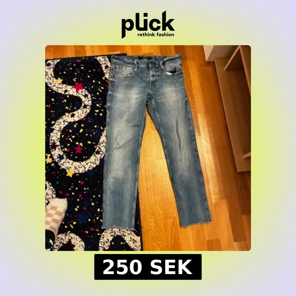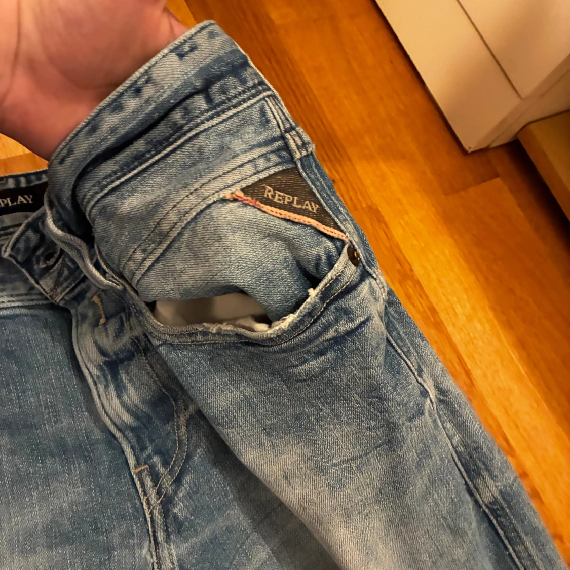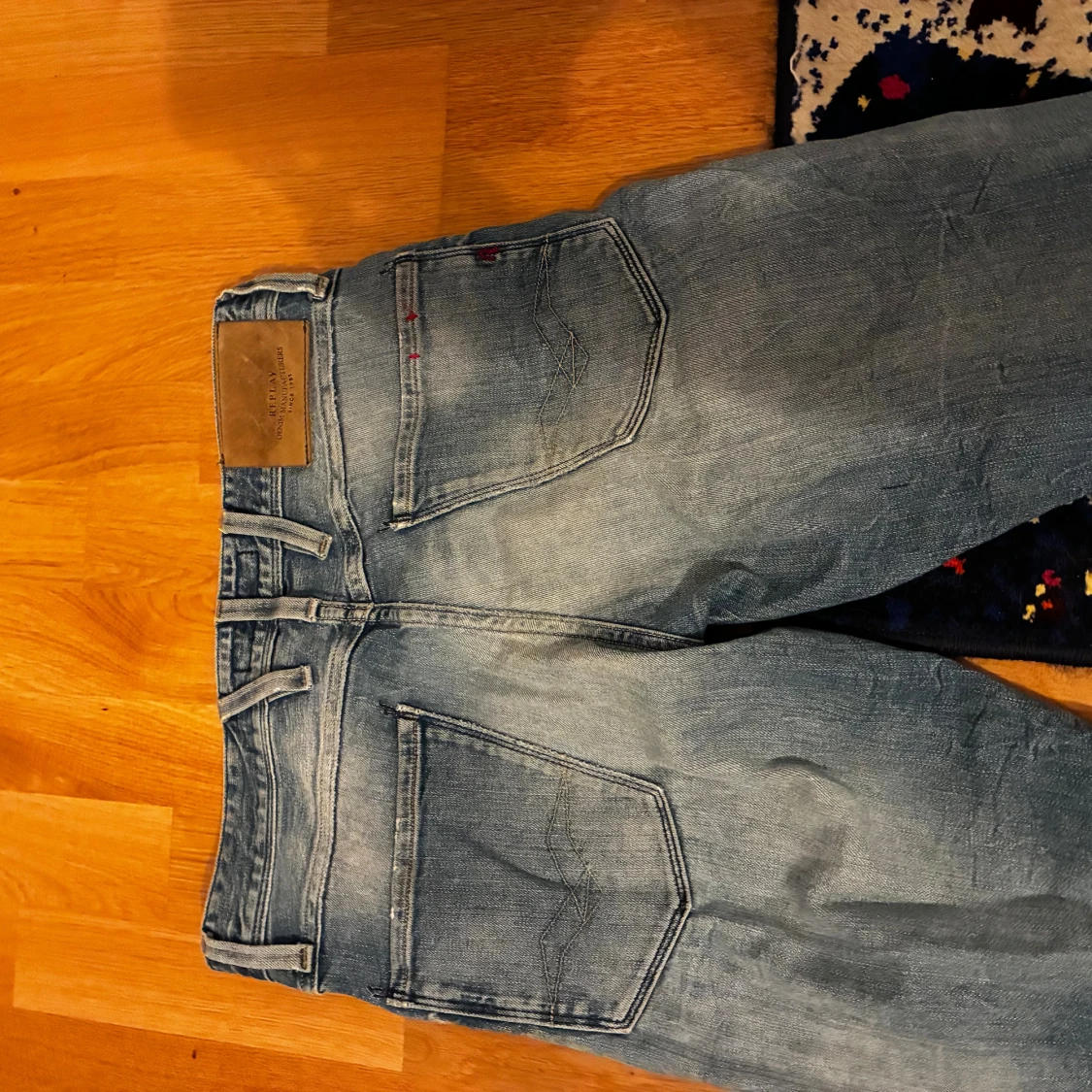 Säljer ett par ljusblå jeans från Replay med snygg tvätt och råa, avklippta benslut. Klassisk femficksmodell med normal passform och raka ben. Jeansen är tillverkade i bomull och har Replay-logga på myntfickan.