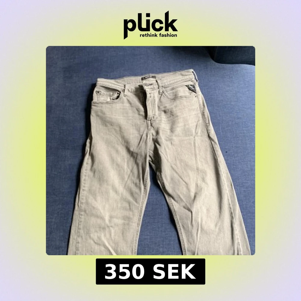 Säljer ett par ljusgrå jeans från Replay med klassisk femficksdesign och snygga detaljer på bakfickan. Jeansen har rak passform och är tillverkade i mjukt bomullsmaterial med en hint av stretch för extra komfort. Perfekta för en clean och stilren look.