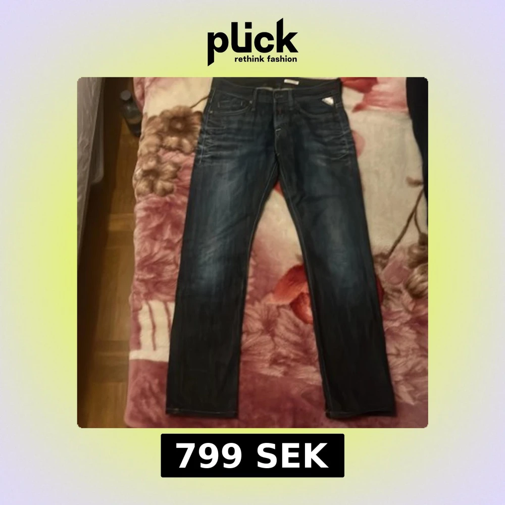 Säljer ett par mörkblå jeans från Replay med klassisk femficksdesign och snygga slitningar. Jeansen har raka ben och tydliga kontrastsömmar. Metallmärke på fickan och Replay-patch bak i midjan. Perfekta för dig som gillar en tidlös look.