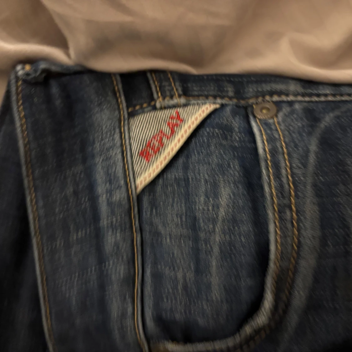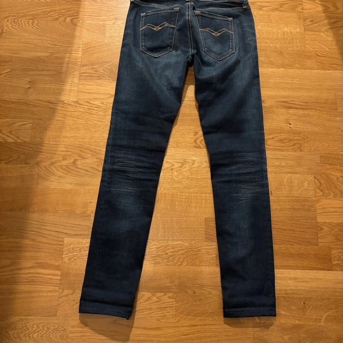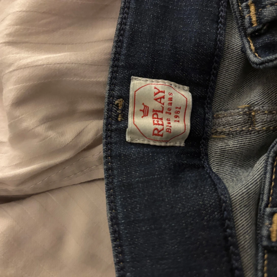 Säljer ett par mörkblå jeans från Replay med snygga broderade detaljer på bakfickorna och klassisk Replay-logga. Jeansen har raka ben och normal passform, tillverkade i slitstarkt denim. Perfekta för dig som gillar stilrena och tidlösa jeans.