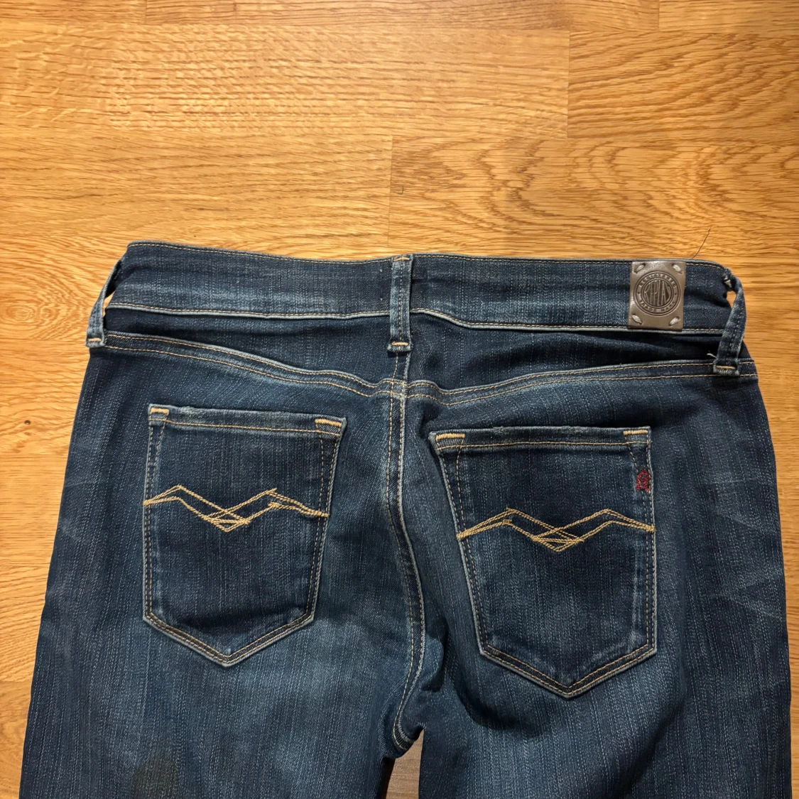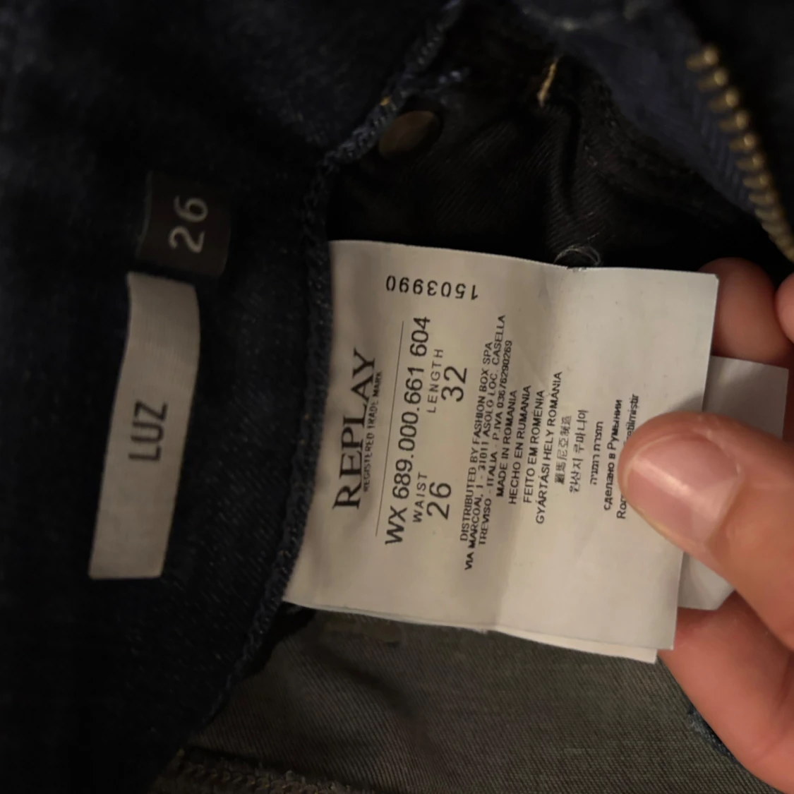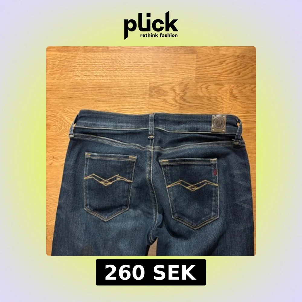 Säljer ett par mörkblå jeans från Replay med snygga broderade detaljer på bakfickorna och klassisk Replay-logga. Jeansen har raka ben och normal passform, tillverkade i slitstarkt denim. Perfekta för dig som gillar stilrena och tidlösa jeans.
