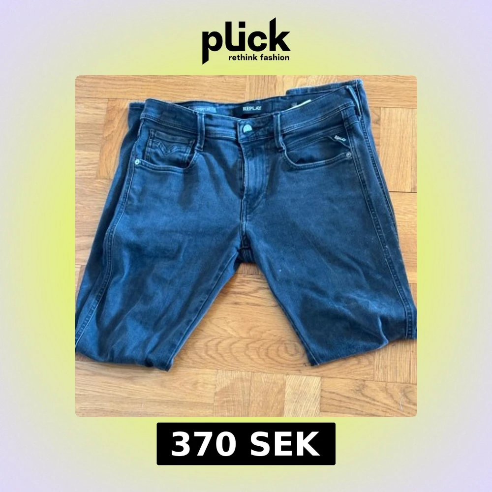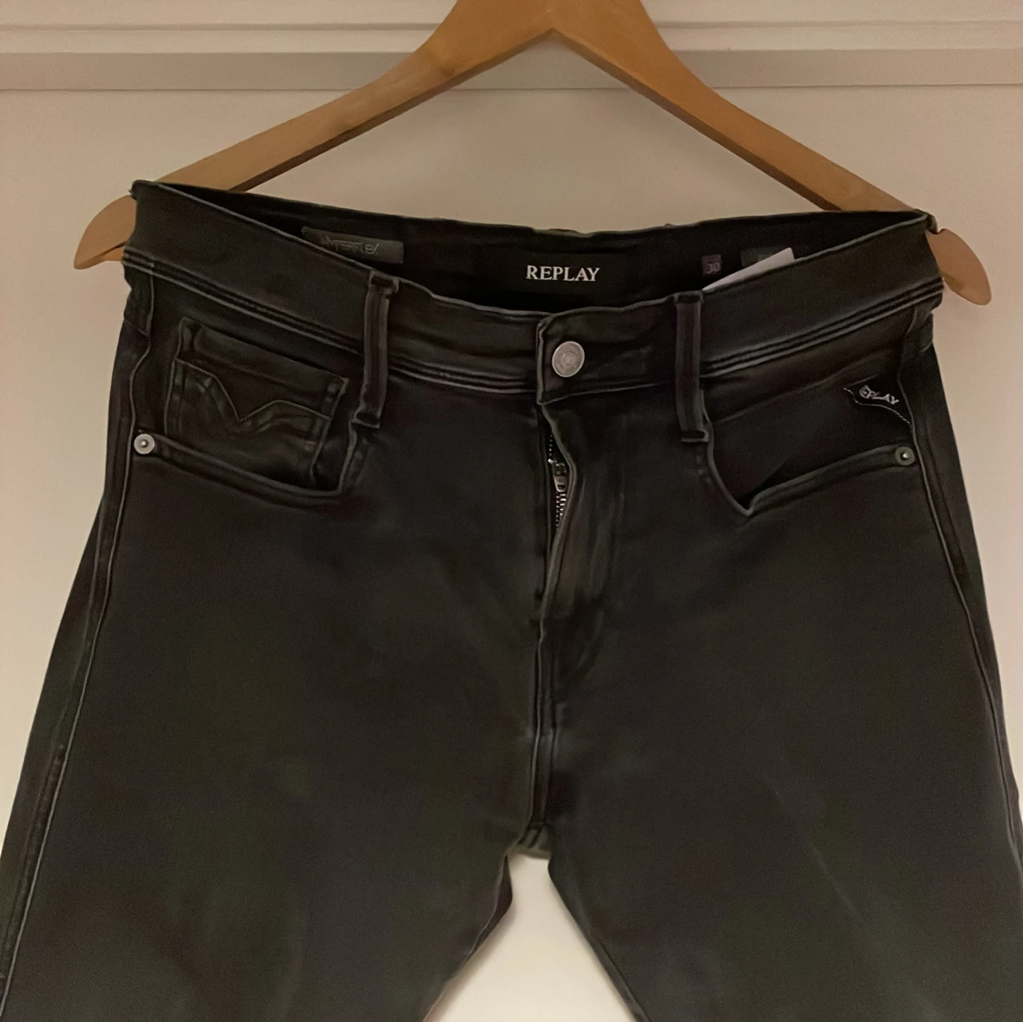 Säljer ett par svarta Replay Anbass jeans i storlek 30. Jeansen har klassisk femficksdesign, smal passform och är tillverkade i stretchigt denim för extra komfort. Snygga detaljer och diskret Replay-logga på fickan.