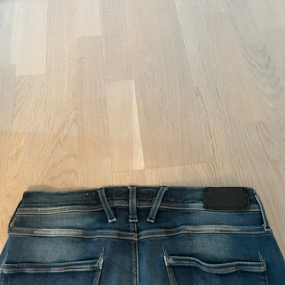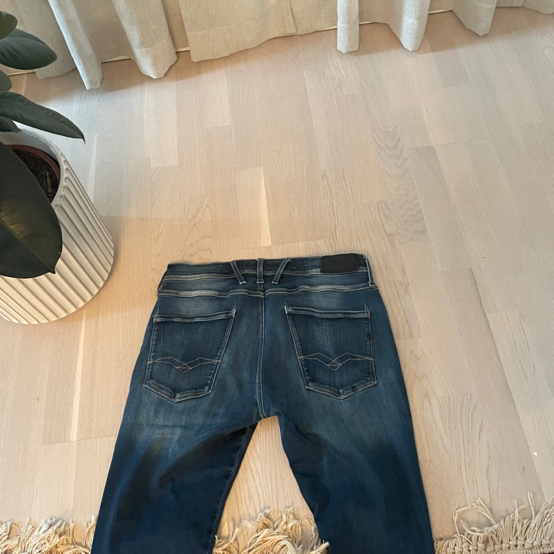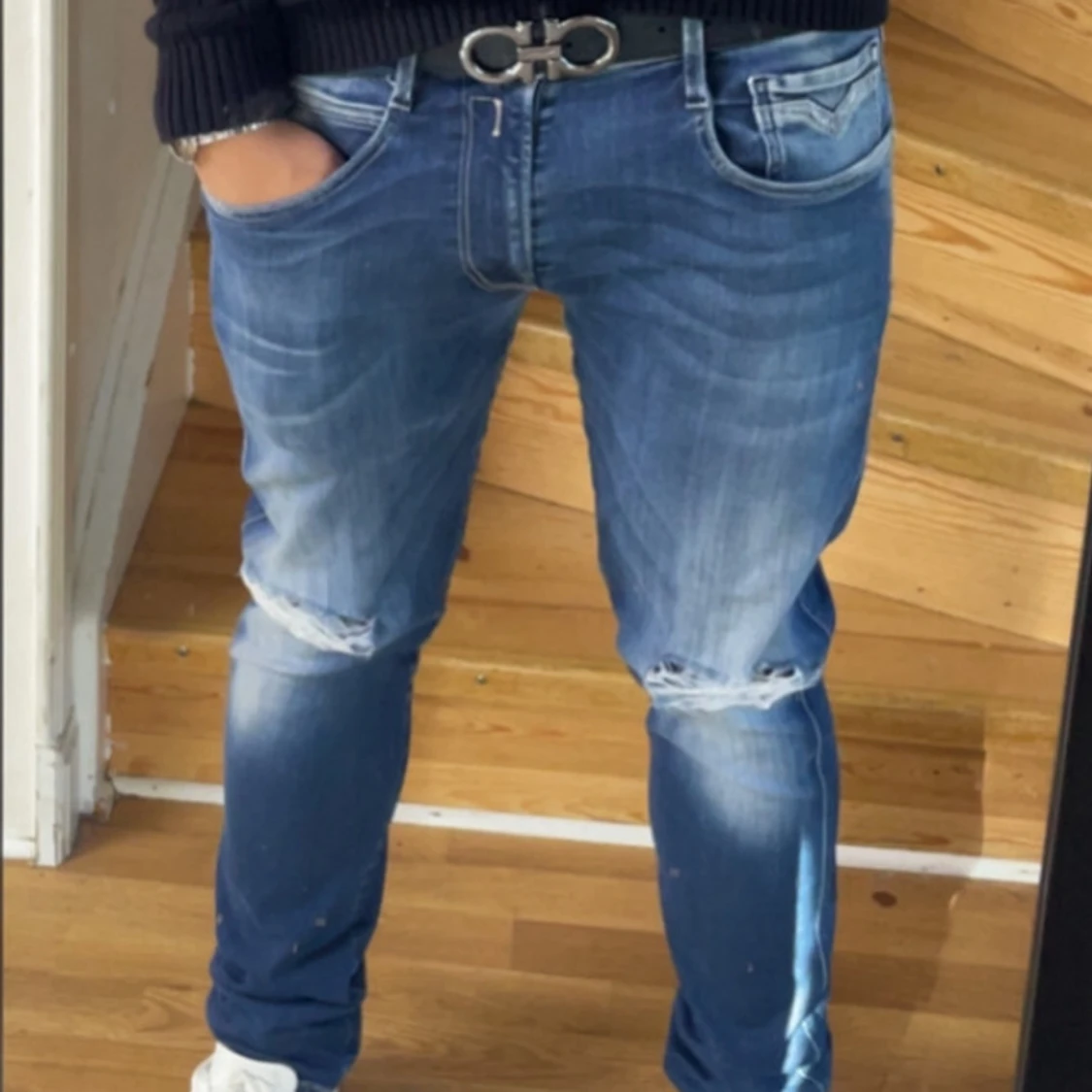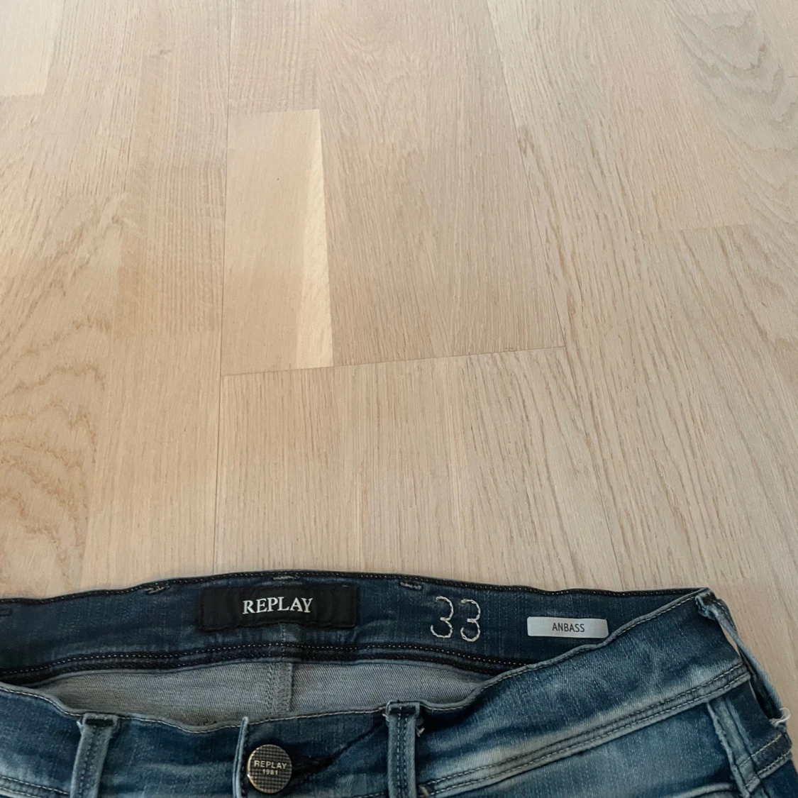 Säljer ett par snygga blå jeans från Replay i modellen Anbass. De har en cool distressed look med slitningar på knäna och en bekväm passform. Perfekta för en casual stil och funkar året runt. 🕶️ bra skick, storlek 33:32.