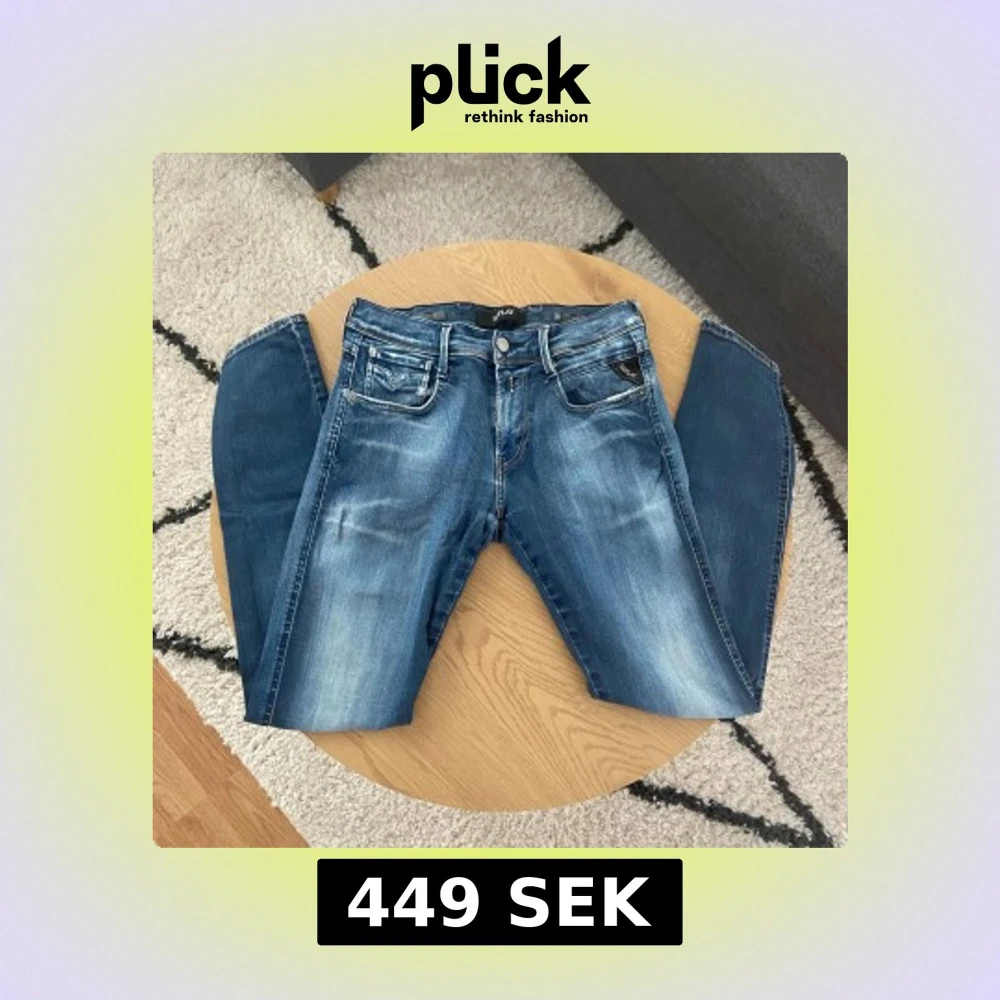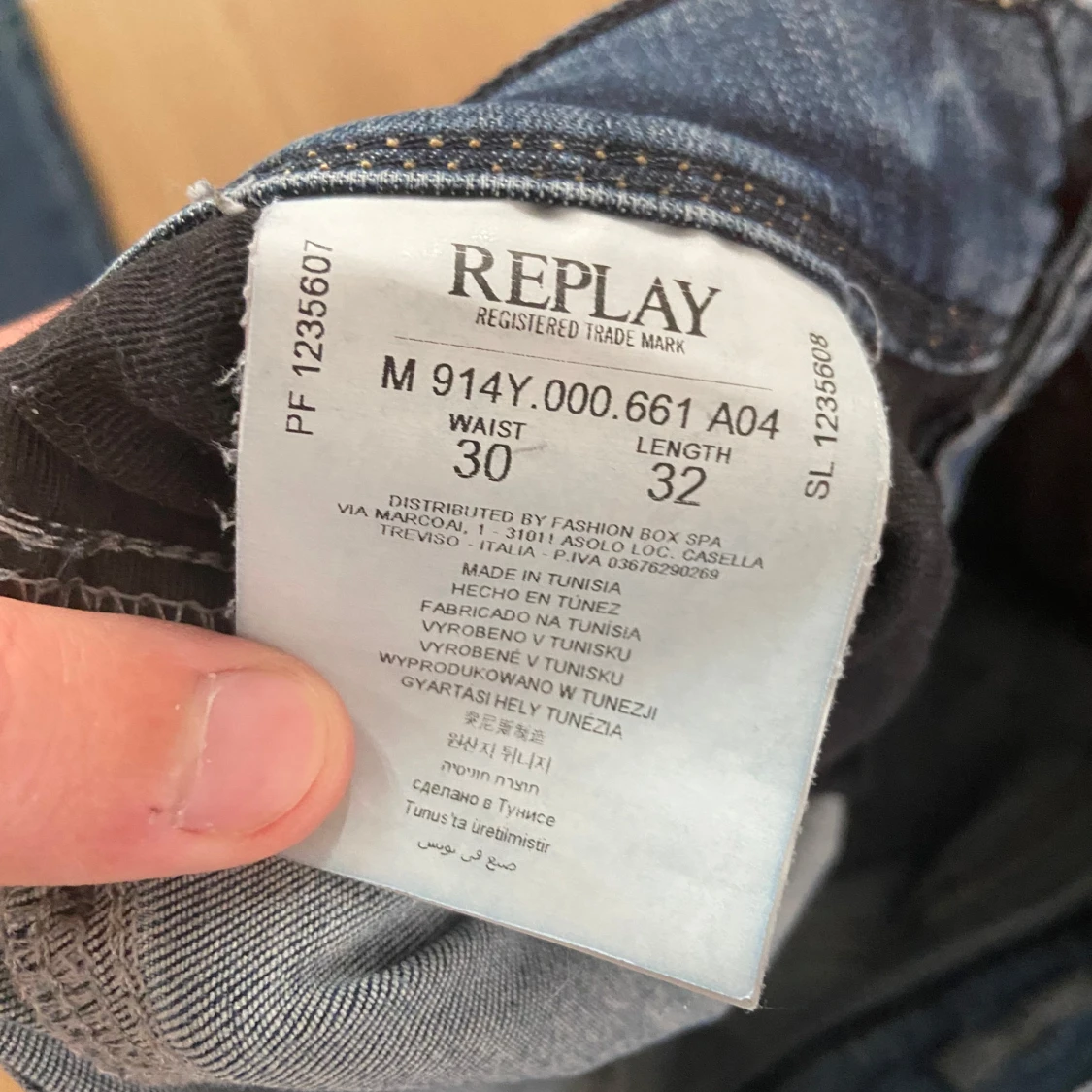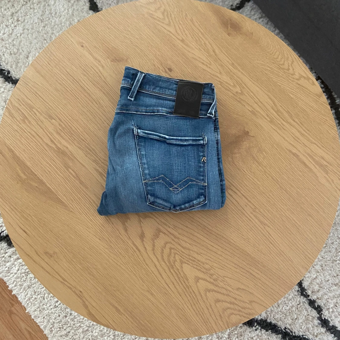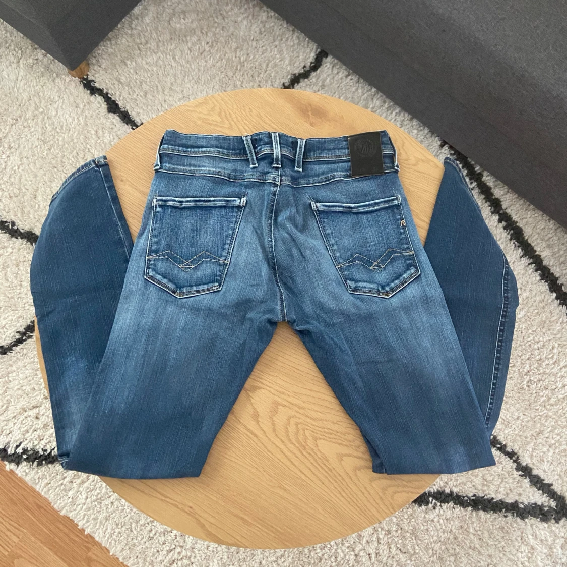 Tjena👋 Säljer nu dessa snygga mörkblåa jeans från Replay med klassisk femficksdesign och coola slitningar🔥 Jeansen har raka ben, normal passform och tydliga kontrastsömmar👖Perfekta för dig som gillar en avslappnad men stilren look🙌 Storleken är W30(36cm) L32(100cm)📐 Byxorna är i Anbass modell och har hyperflex material🪡 Vid frågor: Meddela oss!📩