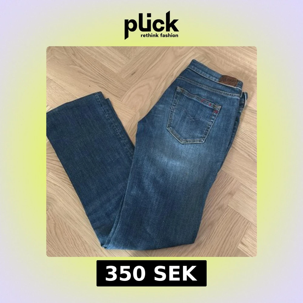 Säljer ett par klassiska blå jeans från Replay, modell Radell. Jeansen, snygga kontrastsömmar och läderpatch bak.