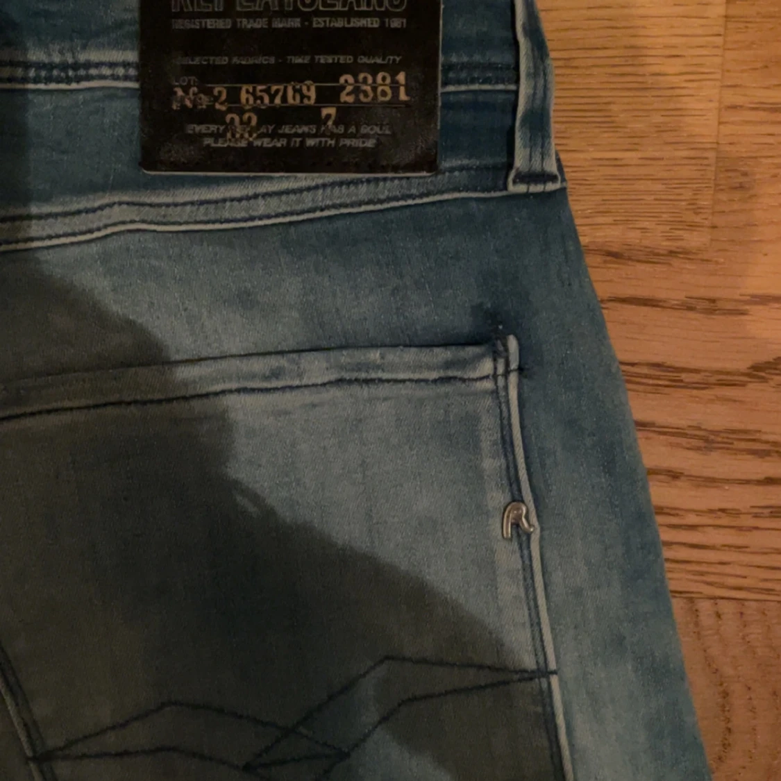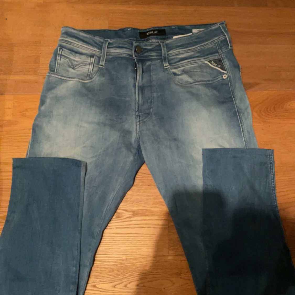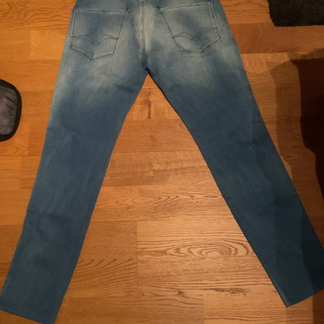 Säljer ett par ljusblå jeansbyxor från Replay med klassisk femficksdesign och dragkedja. Byxorna har raka ben och diskreta slitningar framtill för en avslappnad look. Perfekta för dig som gillar stilrena och bekväma jeans.