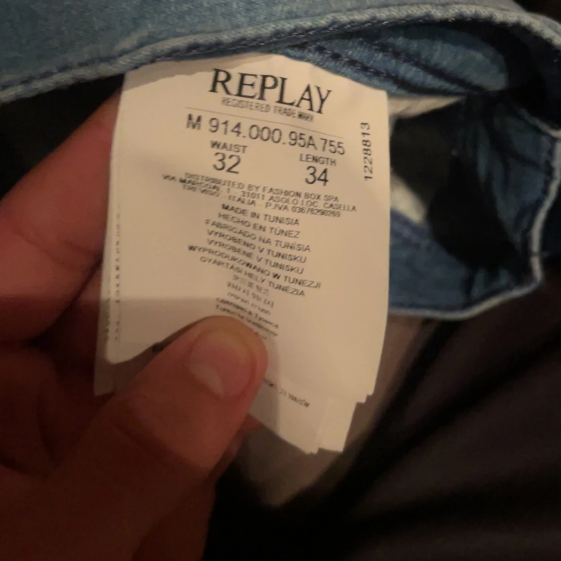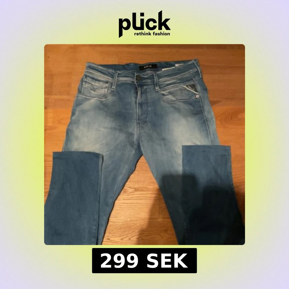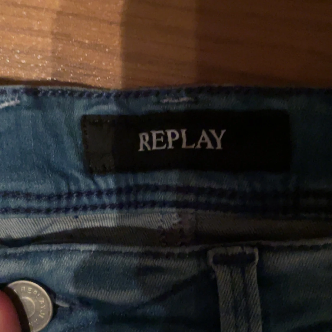 Säljer ett par ljusblå jeansbyxor från Replay med klassisk femficksdesign och dragkedja. Byxorna har raka ben och diskreta slitningar framtill för en avslappnad look. Perfekta för dig som gillar stilrena och bekväma jeans.