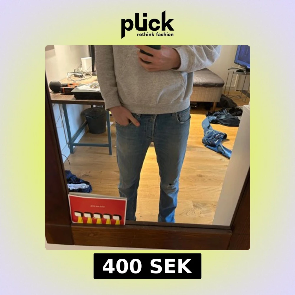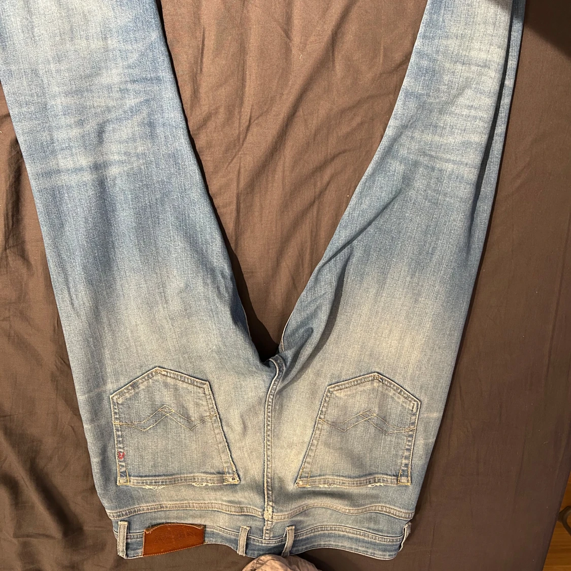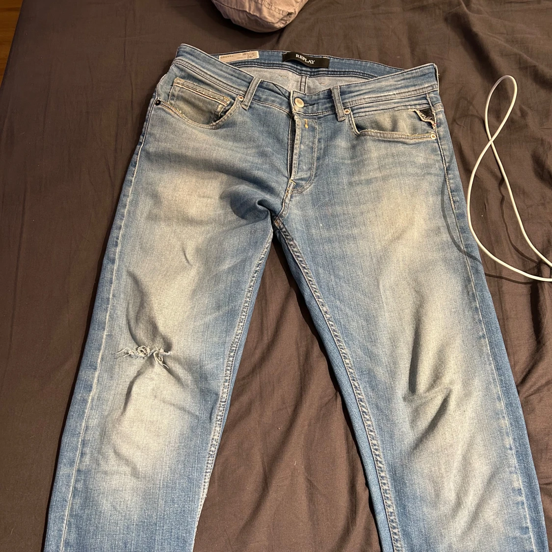 Säljer ett par ljusblå jeans från replay med klassisk femficksdesign och dragkedja. Jeansen har en liten sliten detalj på vänster knä och är i en straight passform. Perfekta för en avslappnad stil.