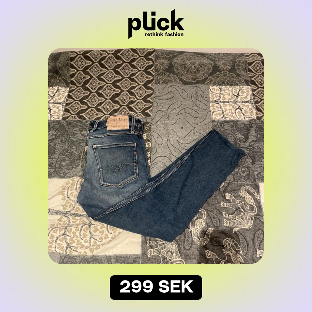 Säljer ett par blå jeans från Replay med slitna detaljer och klassisk femficksdesign. Jeansen har en knappgylf och är i en snygg tvättad blå färg. Perfekta för en avslappnad stil. Storleken är 27/30. (säljer för 299 pga defekter på dom som ni ser på sista bilderna)