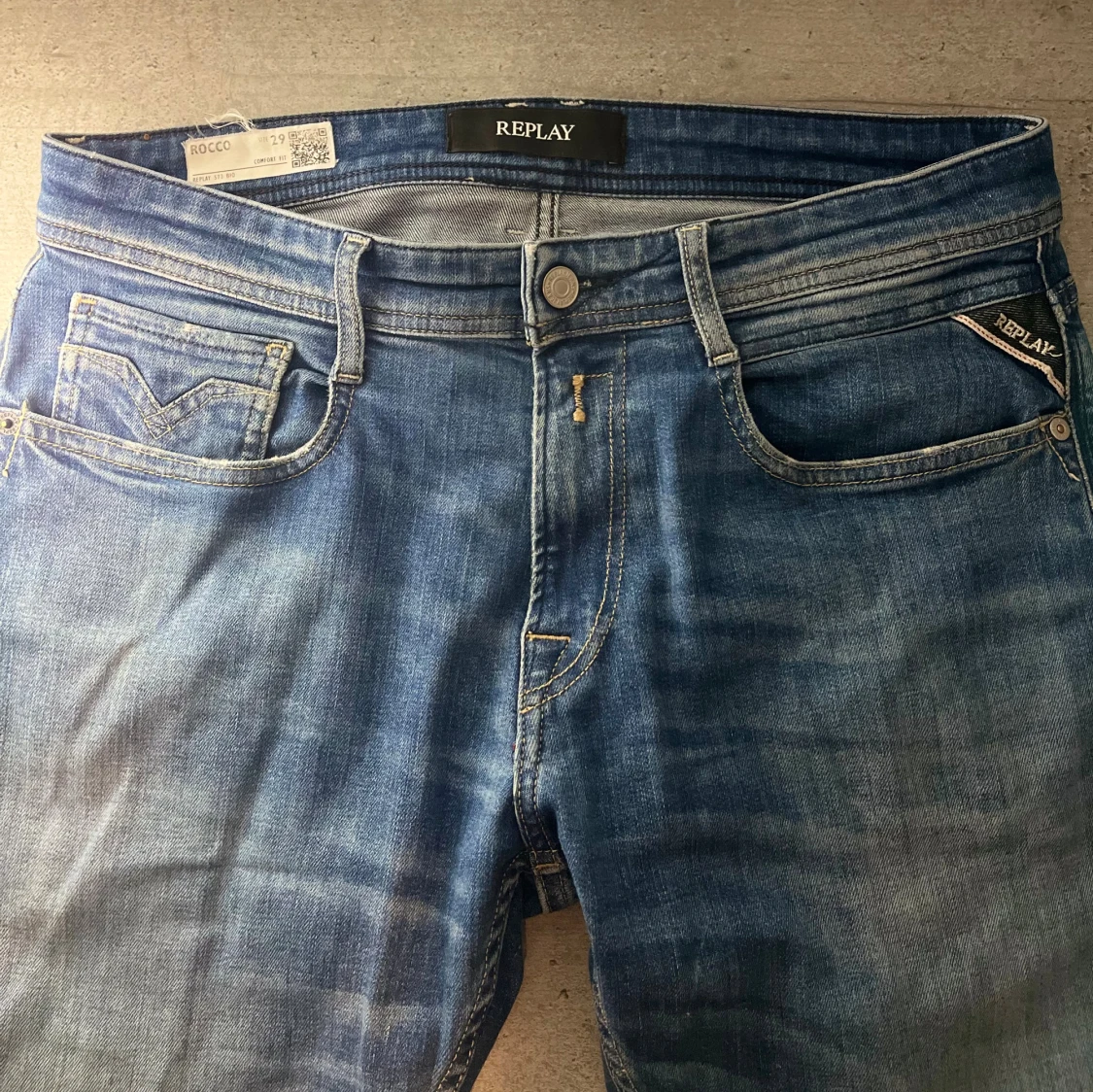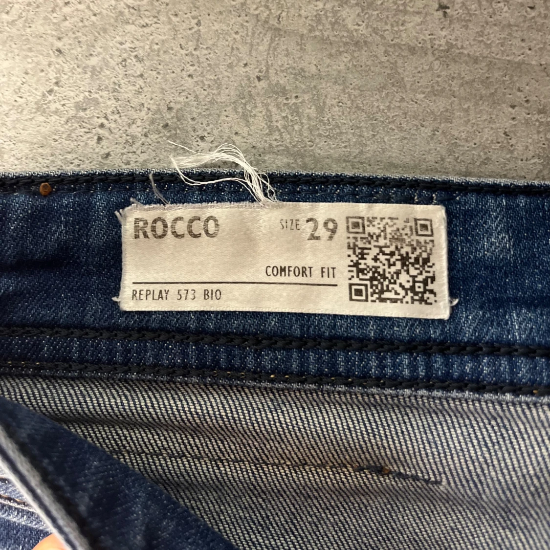 Snygga blå jeans från Replay, modell Rocco med comfort fit. Klassisk femficksdesign, ljus tvätt och detaljerade sömmar på bakfickan. Märkespatch i läder baktill och diskret Replay-logga vid fickan. Perfekta för en avslappnad och trendig look.