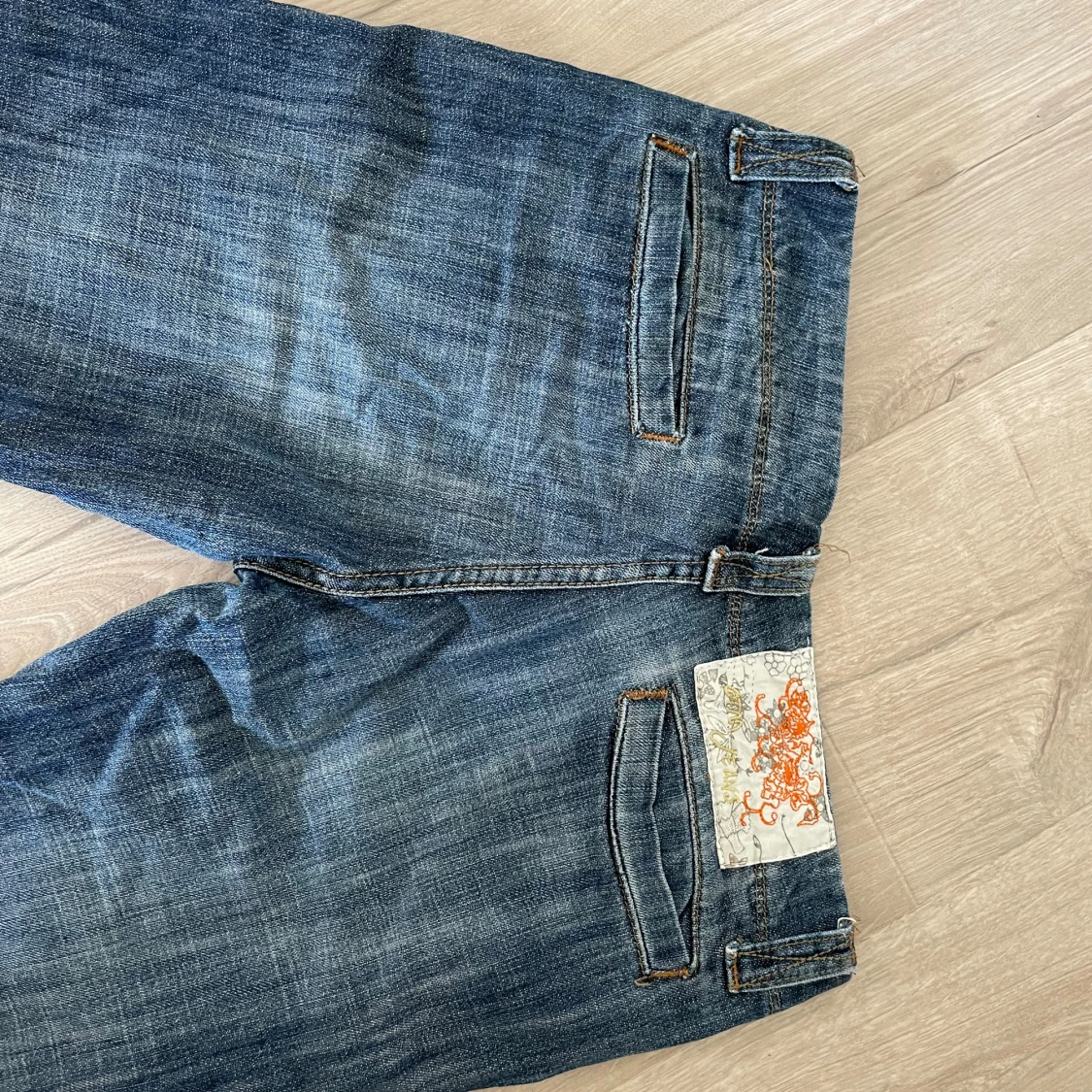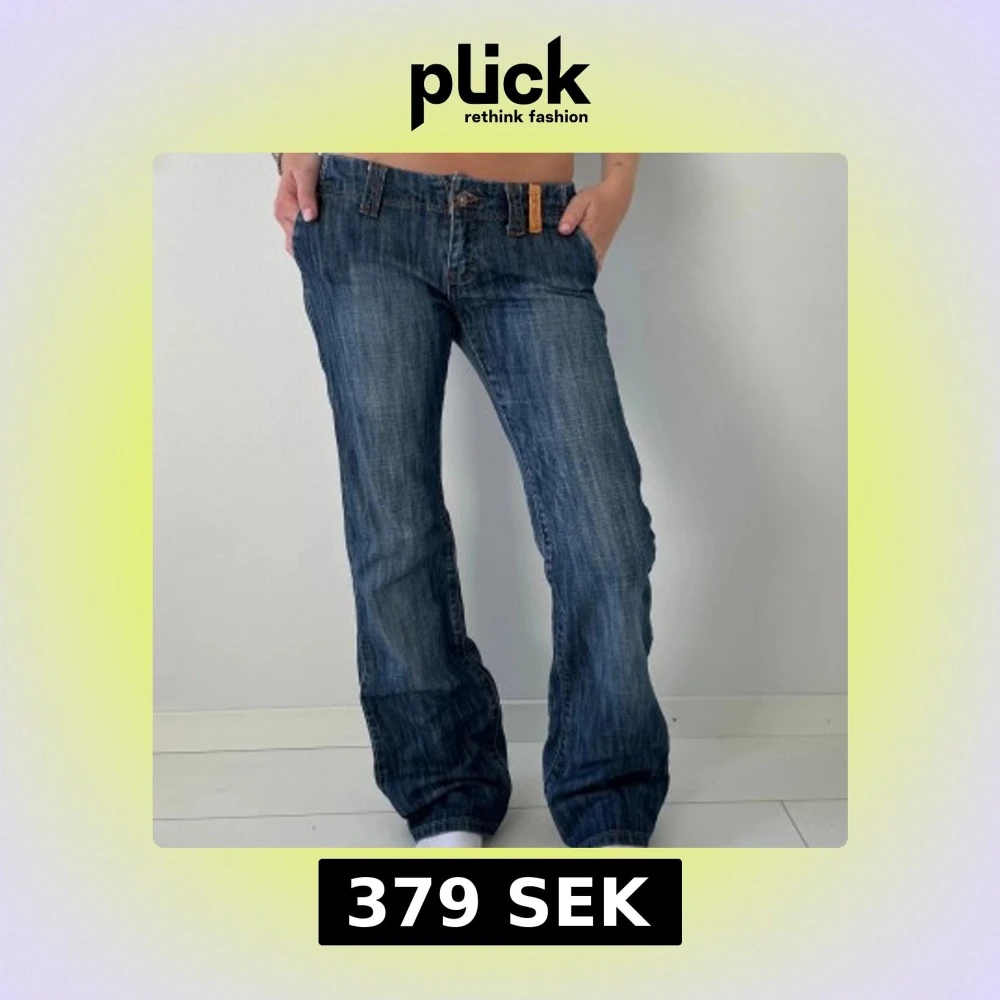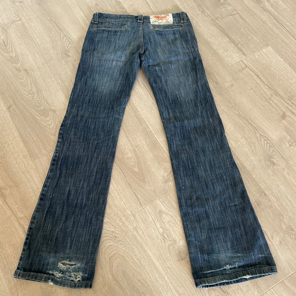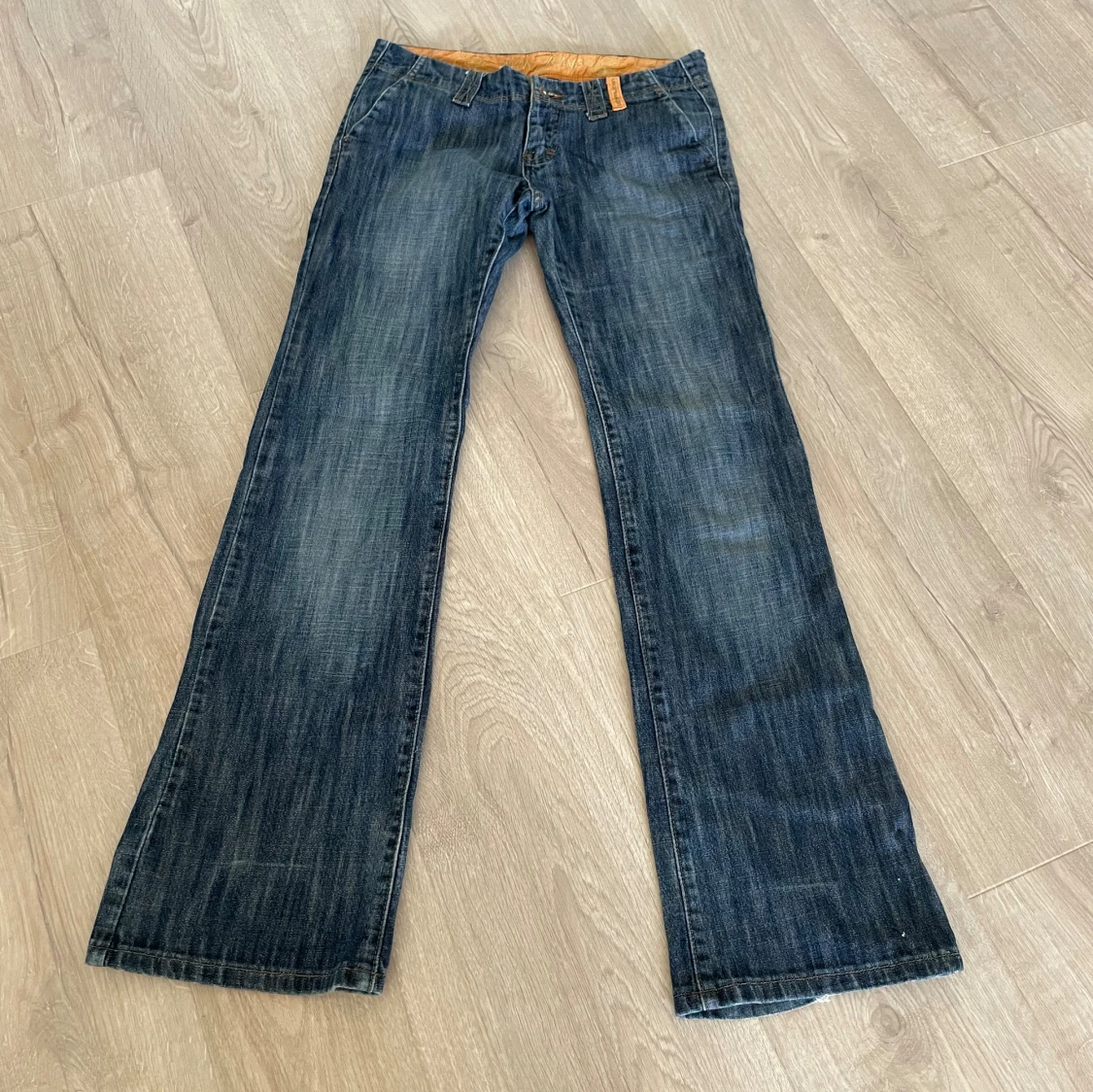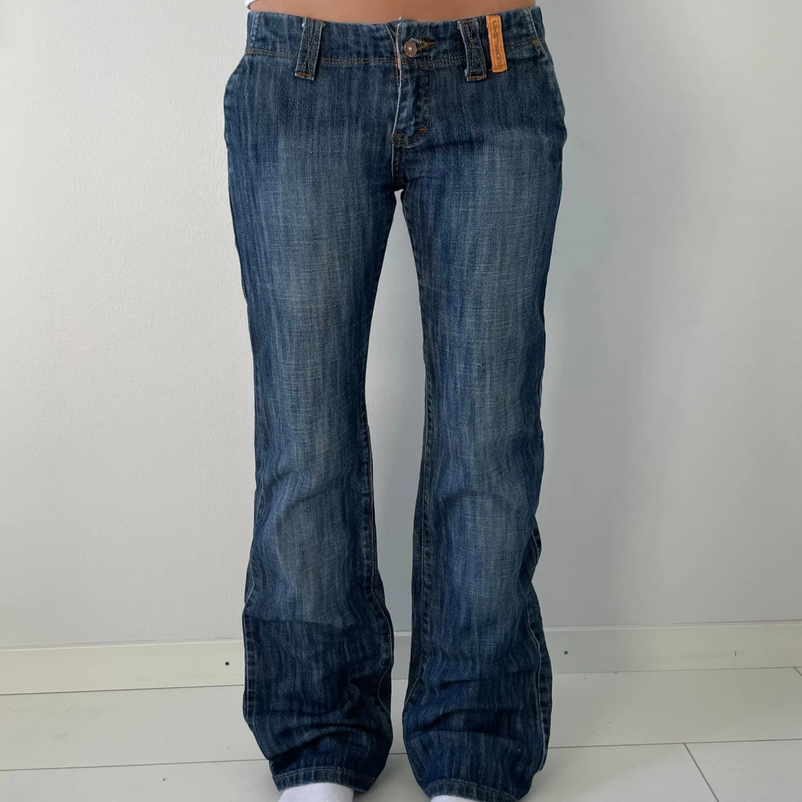 Snygga blå jeans med bootcut passform och låg midja. Jeansen har klassisk femficksdesign, slitningar.
